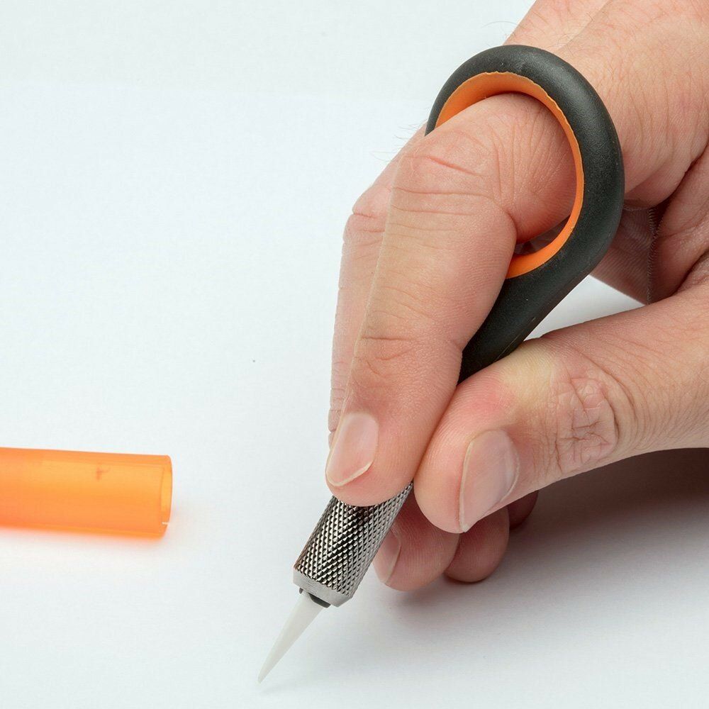 Jedinečná rukojeť přesného nože Slice 10580 nabízí inovativní prstenovou rukojeť, která poskytuje uživateli přesné ovládání detailních řezů a složitých tvarů. Jeho protiskluzový vnitřní prsten a křížové šrafování zajišťují, že nástroj reaguje na každý váš pohyb. Bezpečnostní kryt chrání před nehodami mezi použitími.