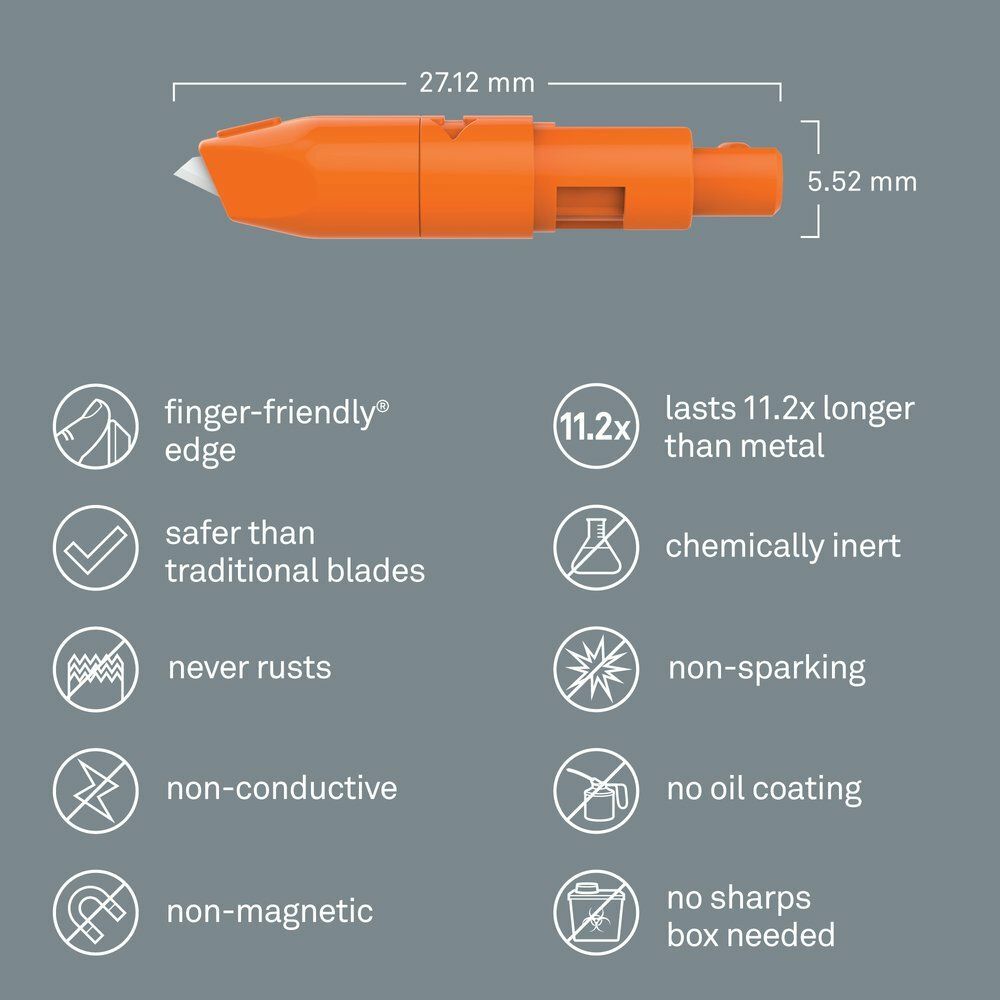 Náhradní čepele SKU 10418 jsou vyrobeny ze 100% oxidu zirkoničitého, což je moderní keramický materiál, který kombinuje řadu užitečných funkcí, které ho odlišují od typických ocelových čepelí. Oxid zirkoničitý je nejiskřivý, nevodivý, nemagnetický, chemicky inertní, nekoroduje a nepotřebuje mazat olejem.