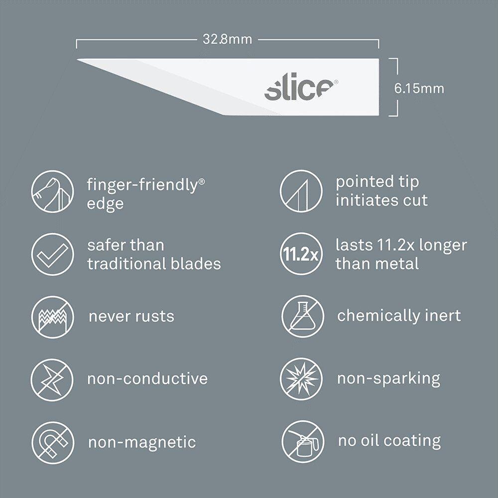 - bezpečnostní čepele Slice jsou chemicky netečné, nemagnetické, nevodivé, nejiskřivé, nerezavějící