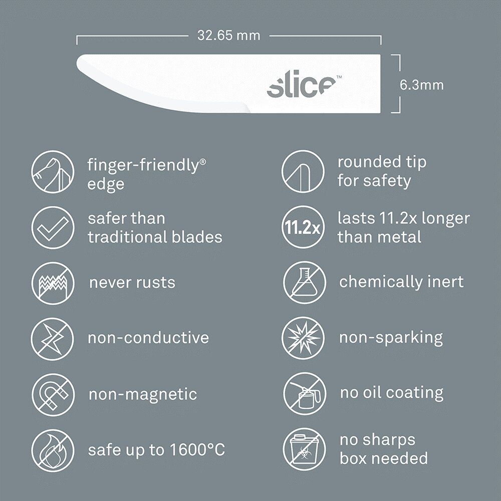 - bezpečnostní čepele Slice jsou chemicky netečné, nemagnetické, nevodivé, nejiskřivé, nerezavějící