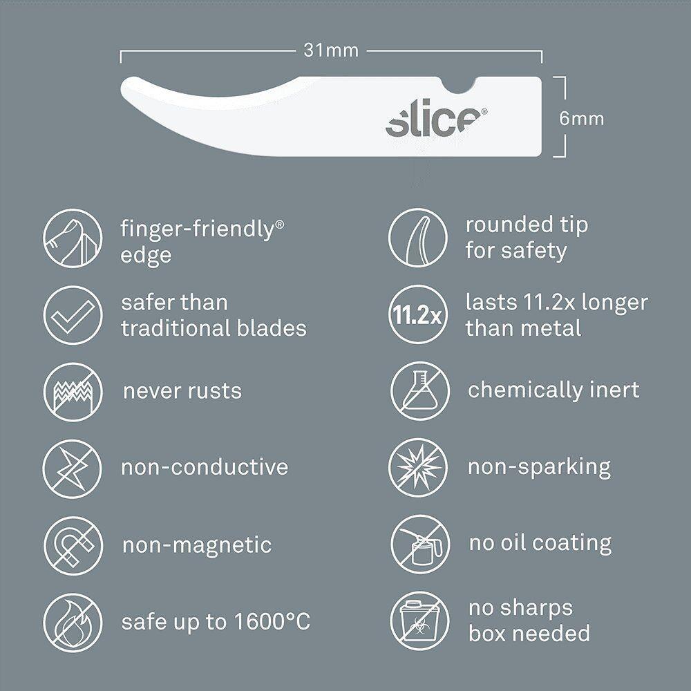 Keramické čepele Slice jsou nejiskřivé, nemagnetické a chemicky netečné. Nepodléhají korozi a vydrží při teplotách až do 1600 °C.
