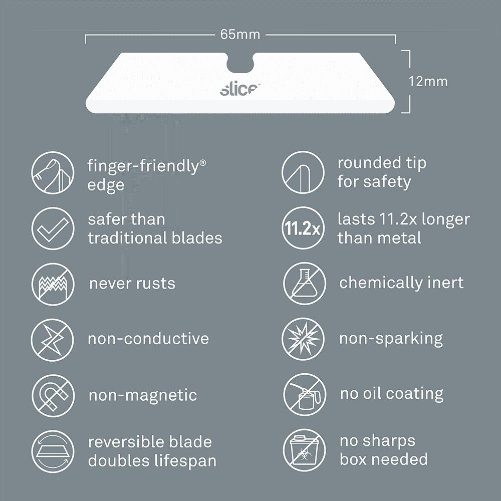 - bezpečnostní čepele Slice jsou chemicky netečné, nemagnetické, nevodivé, nejiskřivé, nerezavějící