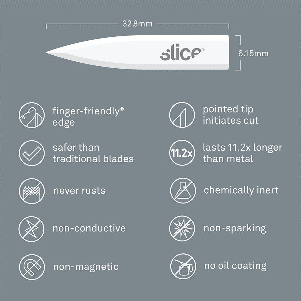 - bezpečnostní čepele Slice jsou chemicky netečné, nemagnetické, nevodivé, nejiskřivé, nerezavějící