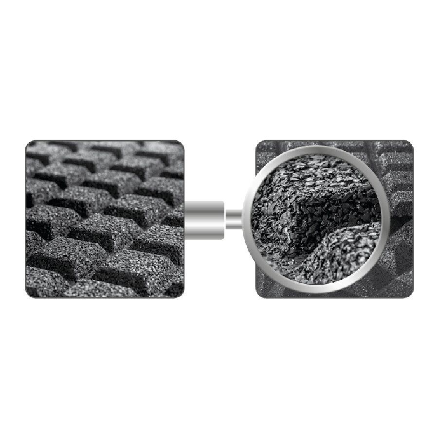 Spodní vrstva je relativně měkká vrstva tvořena tlumící, akustickou a protiodrazovou rohoži s rastrem, díky které je pohyb po této ploše velmi pohodlný a případě pádu zbraně nebo součástí výstroje zabraňují jejím poškození. U tohoto provedení s rastrem je výhoda v tom, že střela v prostoru rastru zapadne a tedy nehrozí zde nadzvednutí podlahy při proražení střely. Tato akustická tlumící rohož se skládá ze základny desky a rastru tvořeného řadami komolých jehlanů. U tohoto rozměru je deska složena z 2 cm vysoké základny a z 1,5 cm vysokých komolých jehlanů.