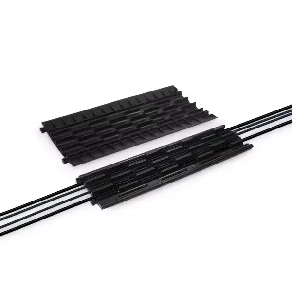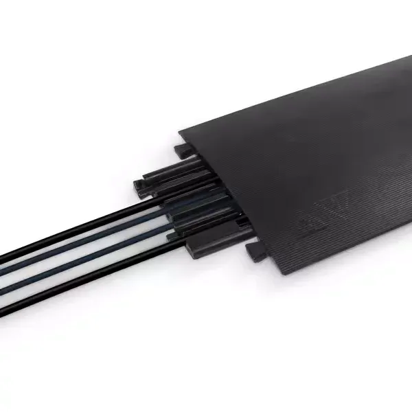 Černý plastový kryt na kabelový most DEFENDER COMPACT je sedmi kanálový most, sloužící k ochraně kabelů, hadic či trubek na chodnících, ve výrobních provozech, na výstavách, kulturních akcích, v kancelářích apod.