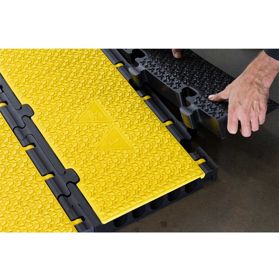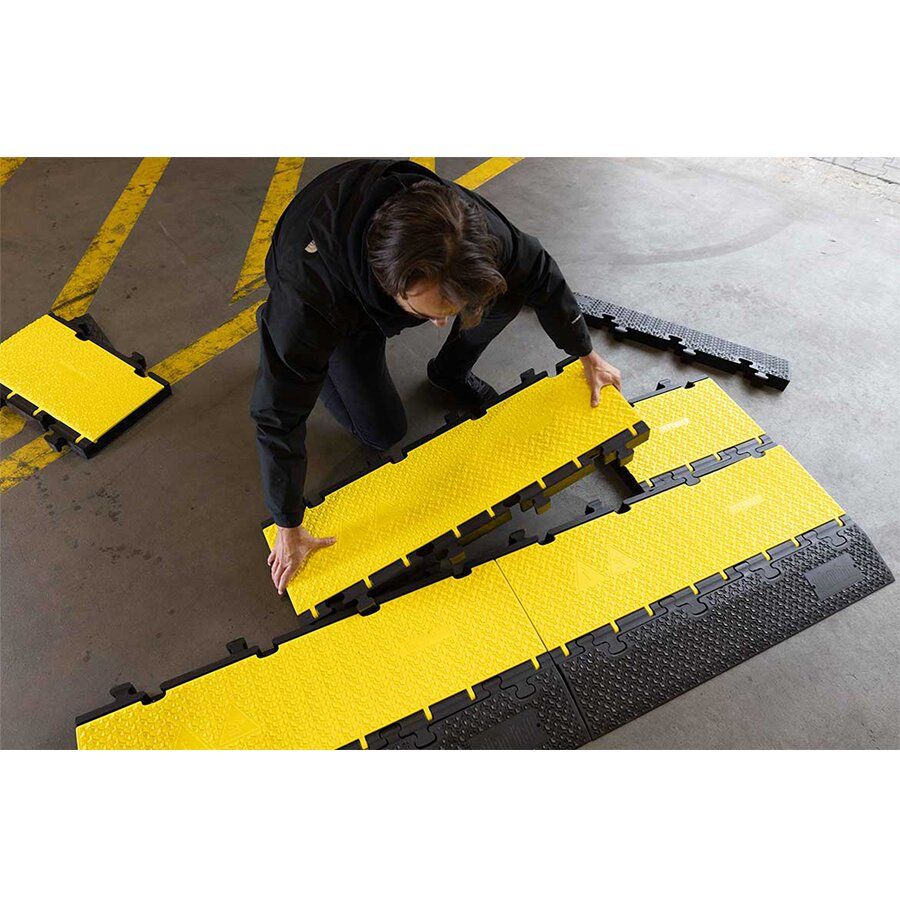 Nájezdová rampa DEFENDER 3 2D R disponuje protiskluzovým povrchem pro ochranu kabelů, hadic či trubek na chodnících, ve výrobních provozech, těžkých pracích, na výstavách, kulturních akcích apod.