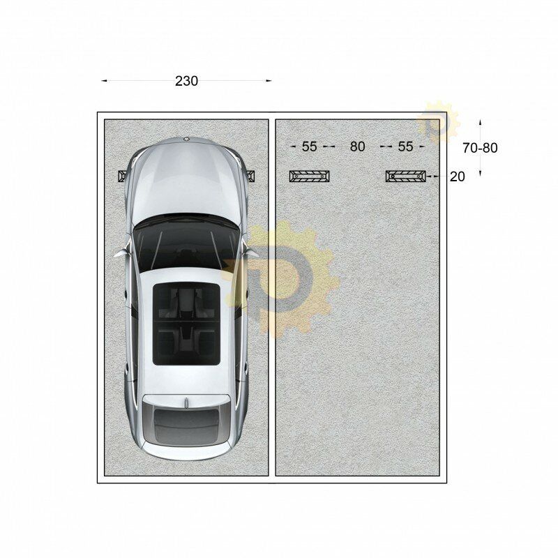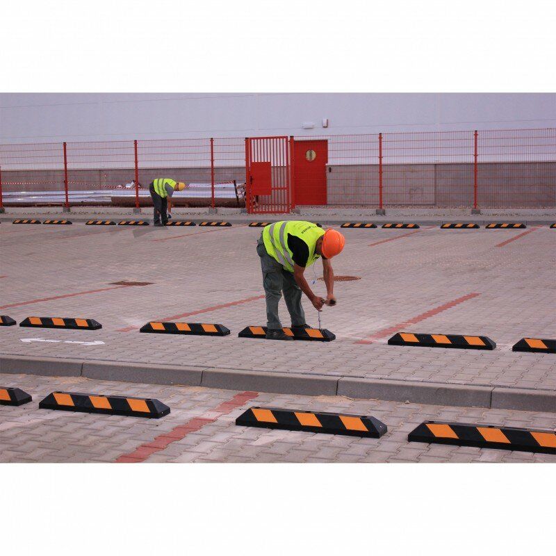 Instalace dorazu se provádí pomocí rozpěrných šroubů Ø12 (nejsou součástí balení). Dorazy se doporučuje umístit 70–80 cm od stěny, sloupu nebo jiného pevného bodu tak, aby účinně blokovaly přední či zadní kola vozidel.