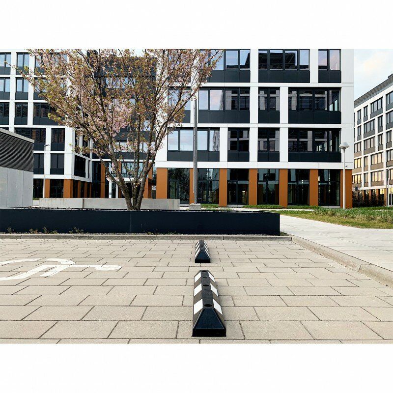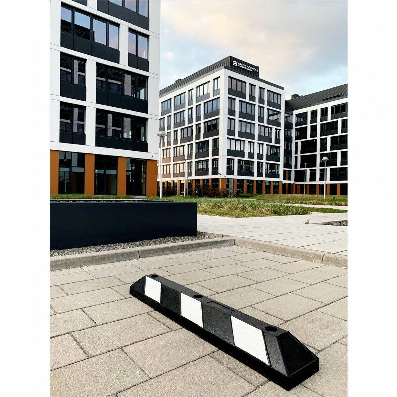 Černo-bílý gumový reflexní parkovací doraz jsou vyrobeny z extrémně odolné, jednotné a trvdé pryžové směsi. Při vystavení nepříznivým povětrnostním podmínkám se material nedelaminuje ani nebarví. Tyto dorazy označují hranici parkovacího místa. Jsou opatřeny diagonálními pruhy reflexní páseky.