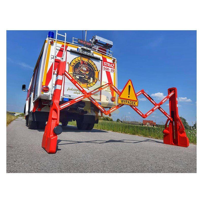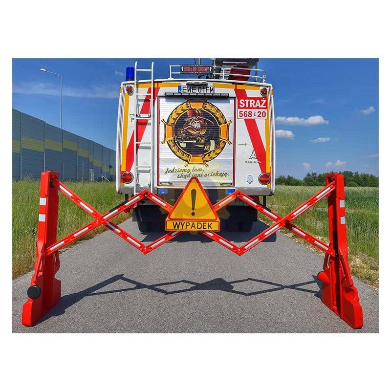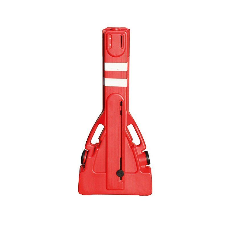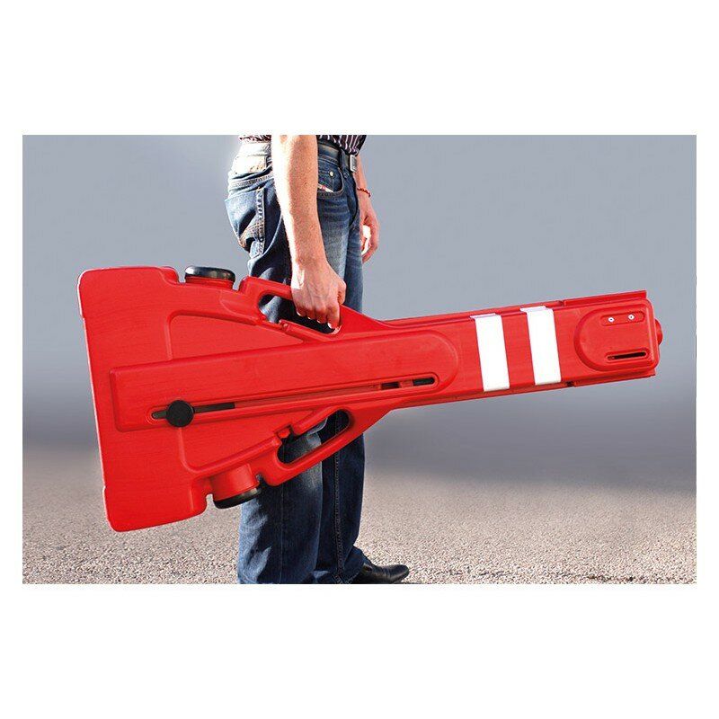 Bílo-červená skládací zábrana, k umístění na stavby, silničních pracích. Jsou vyrobeny z plastu odolného vůči nepřiznivým povětrnostním podmínkám. Pro zvýšení stability těchto nůžkových bariér by měly být naplněny vodou nebo pískem.