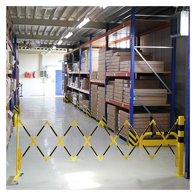 Černo-žlutá bariéra se čtvercovým sloupkem. Vyrobena z vysoce kvalitní oceli. Skládací zábrana je vybavena pojízdným sloupkem s kolečky. V nabídce jsou bíle a červeně lakované ocelové zábrany (označené z obou stran reflexní fólií) nebo žluté a černé.