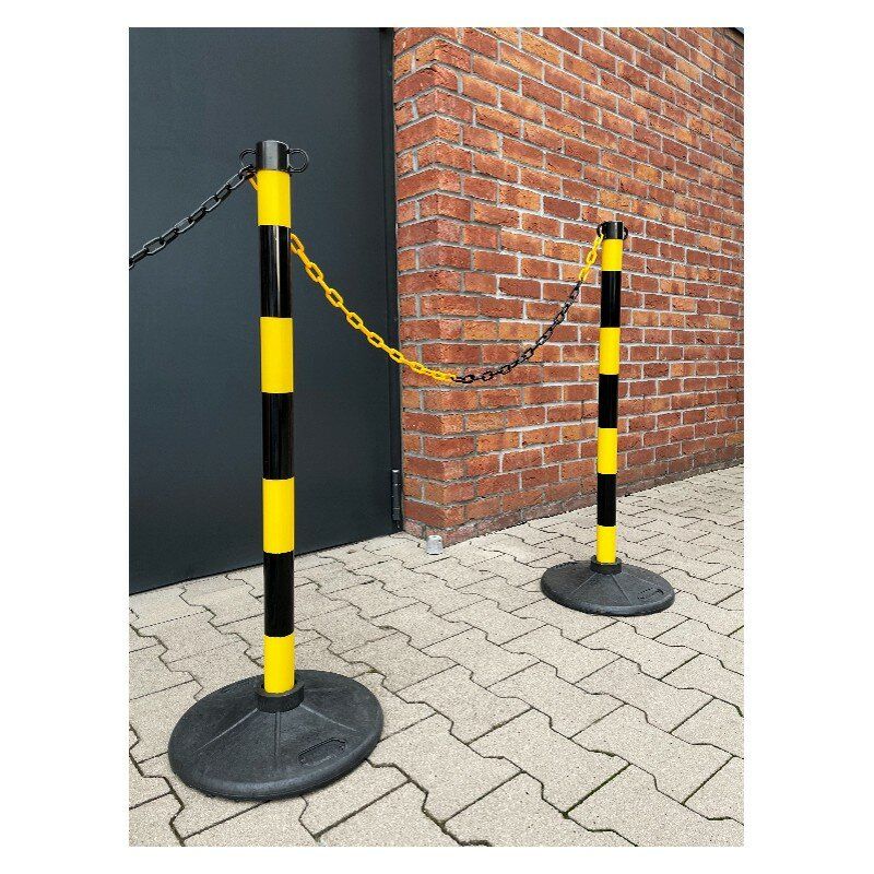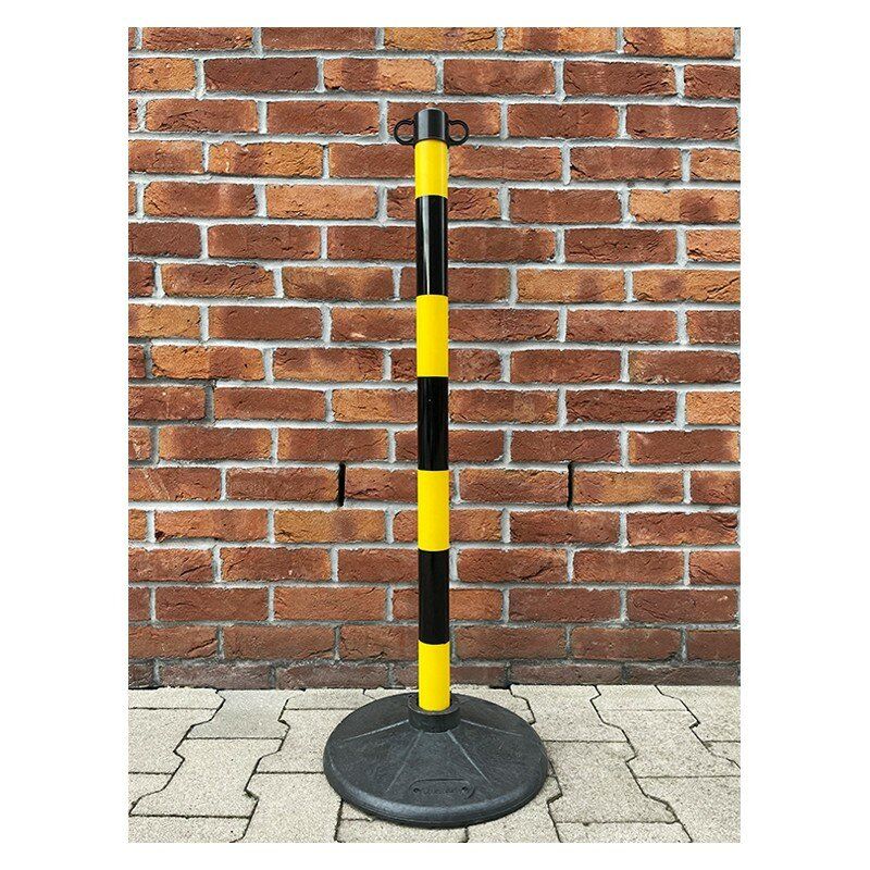 Černo-žlutý vymezovací sloupek na řetěz. Snadno se přenášejí a přepravují. V nabídce jsou bílo-červené nebo žluto-černé. Výrobky se prodávají jednotlivě nebo v sadách: 2 sloupky a 1 řetěz o délce 3,0 m. Sloupy mají stabilní kulaté pryžové základny. Řetěz lze zkrátit na libovolnou délku. Toto balení obsahuje pouze sloupek.