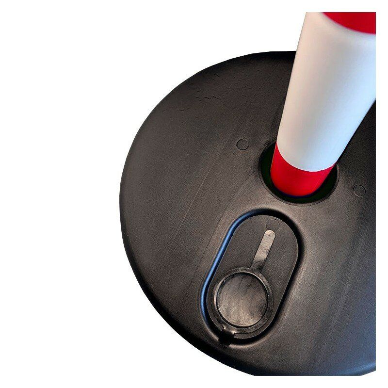 sBílo-červený plastový vymezovací sloupek s podstavou na výplň. Aby byla zachována odolnost a stabilita systému oplocení, měly by být jejich základy doplněny vodou nebo pískem. Snadno se přenášejí a přepravují. V nabídce jsou bílo-červené nebo žluto-černé. Plastový řetízek se na čepici připevňuje odříznutím posledního článku (zářez umožňuje provlečení segmentu řetízku uzavřeným okem čepice) nebo dodatečně pomocí spojky "S". Sloupy mají stabilní kulaté pryžové základny. Řetěz lze zkrátit na libovolnou délku. Toto balení obsahuje pouze jeden sloupek.