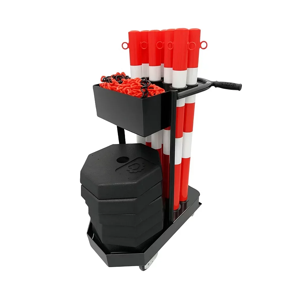 Bílo-červený plastový vymezovací sloupek s pryžovou základnou je součástí mobilního systému pro rychlé a efektivní vymezení pracovních zón ve vnitřních i venkovních prostorách. Nabízené sady obsahují kombinaci pojízdného vozíku, plastového řetězu a ocelových sloupků s pryžovou základnou. Pojízdný vozík zajišťuje snadnou přepravu a uskladnění všech prvků – sloupků, řetězu i základen.