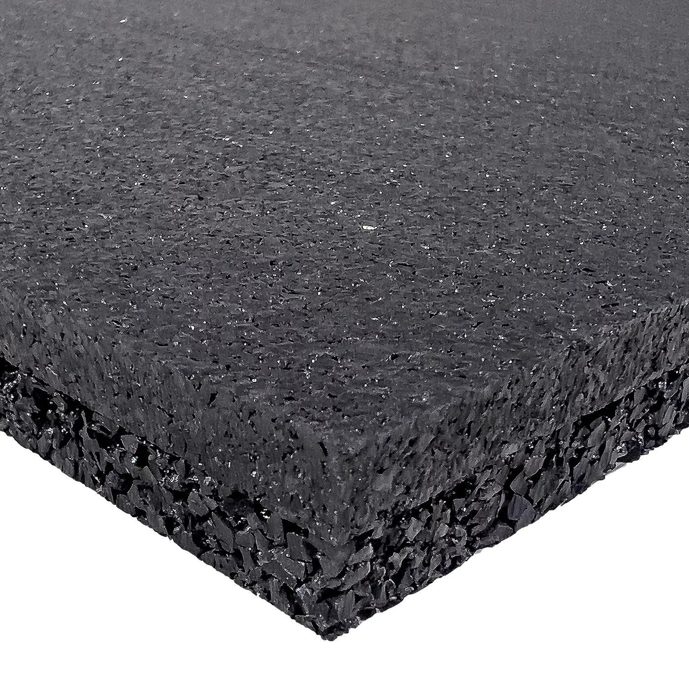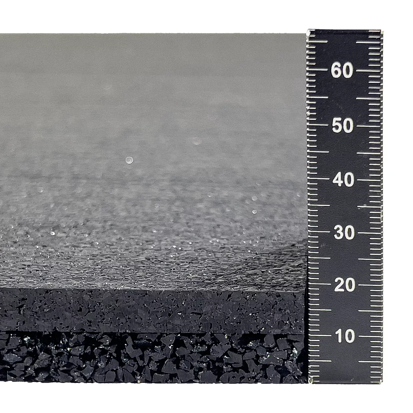 Podlahová guma (deska) SF1050 s antivibrační elastomerickou deskou S650. Kombinace fitness desky a antivibrační desky využijete především v místech kde potřebujete odolný povrch a zároveň odtlumení vibrací.