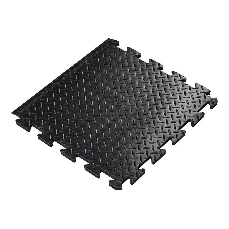 Povrch dlažby s diamantovým vzorem je vyroben z tvrzeného PVC nabízející dobrou mechanickou i chemickou odolnost. Pěnová rubová strana dlažby zmírňuje únavu při dlouhodobém stání a chrání pracovníky před negativními vlivy studených betonových podlah.