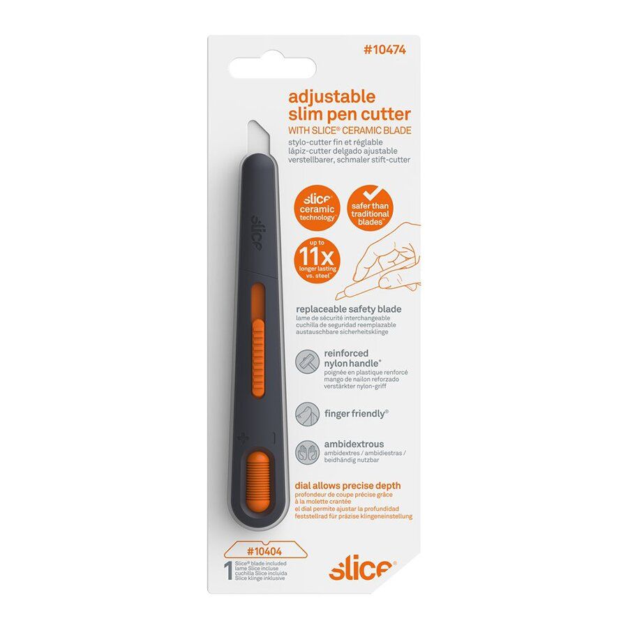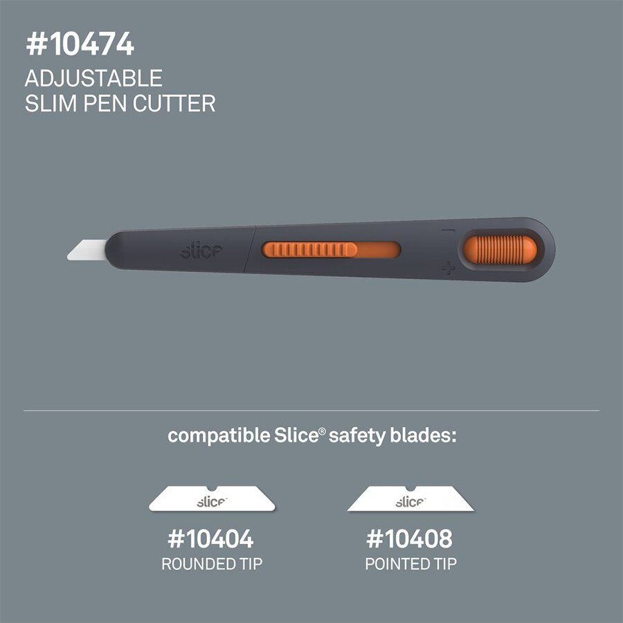 Nože s nastavitelnou čepelí na krabice Slice 10474. Díky zabudovanému válečku k upravení délky čepele si můžete snadno zvolit přesnou délku řezu pro každý z vašich projektů. Válečkem lze regulovat, jak daleko se čepel vysune. Jakmile je délka čepele nastavena, můžete používat posuvník stejně jako u našich samo-zatahovacích nástrojů – čepel bude vysunuta pouze do vaší předem nastavené délky. Když posuvník uvolníte, čepel se sama zatáhne do rukojeti, čímž vás bude chránit v době, kdy s nástrojem nepracujete