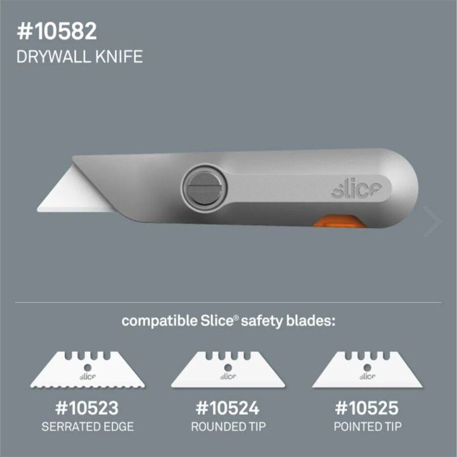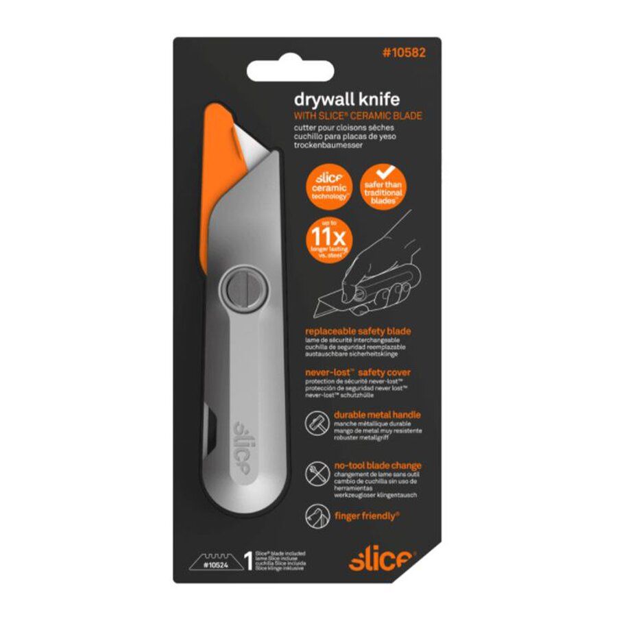 Nůž na sádrokarton Slice 10582 byl navržen s radami od profesionálů na sádrokarton a zahrnuje všechny funkce, které požadovali. Jeho robustní hliníková rukojeť se na konci čepele zužuje, což umožňuje snazší manipulaci – zvláště užitečné, když držíte metr, abyste udrželi konzistentní vzdálenost od okraje, zatímco provádíte řez sádrokartonu. Instalovaná čepel Finger-friendly bezpečnostním integrovaným krytem vám při práci se sádrokartónem zajistí bezpečnost jako žádný jiný nůž.