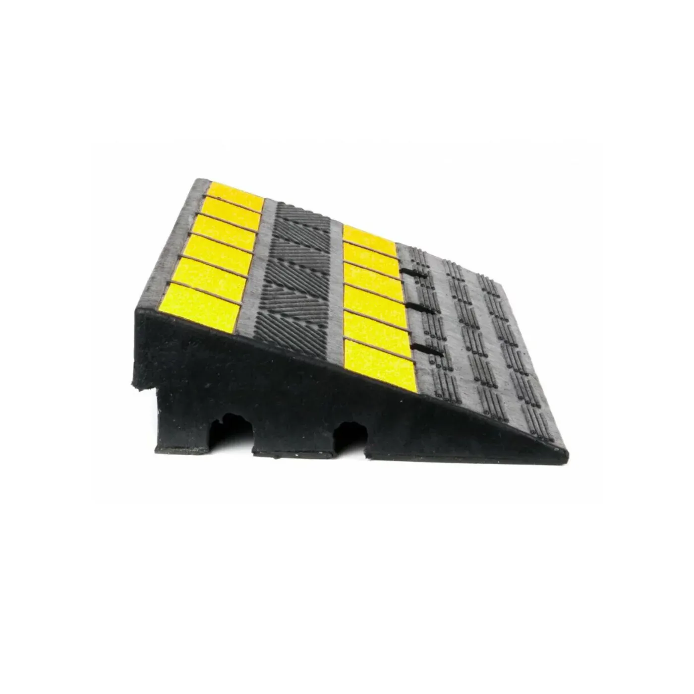 Černo-žlutá gumová nájezdová rampa k obrubníku umožňují volný přejezd kol vozidel a jiných dopravních prostředků přes převýšení cca 10 cm. Určeno zejména pro osobní automobily, dodávky a vysokozdvižné vozíky. Rampy se používají dočasně, lze je i trvale připevnit k zemi.