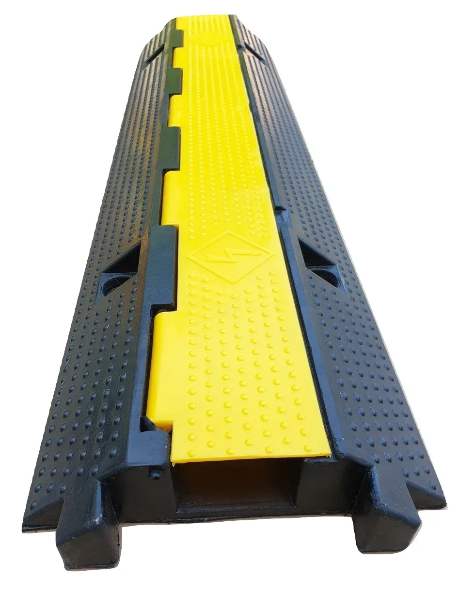 Černo-žlutý kabelový most efektivně chrání kabely před poškozením způsobeným chodci nebo vozidly a jeho nosnost dosahuje až 20 tun při správném uchycení na rovnou plochu, což umožňuje ochranu i před těžkými vozidly, jako jsou kamiony a autobusy.