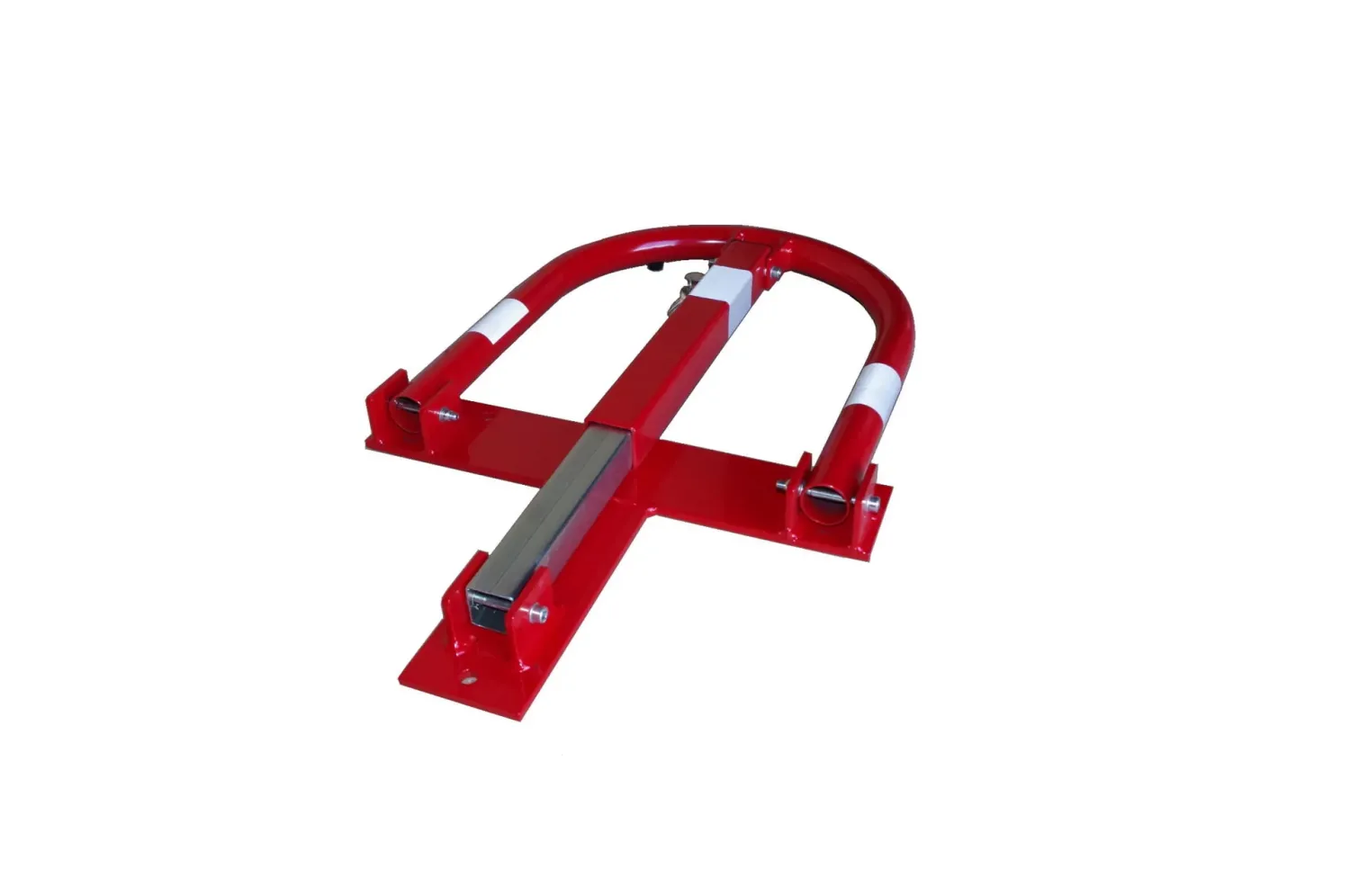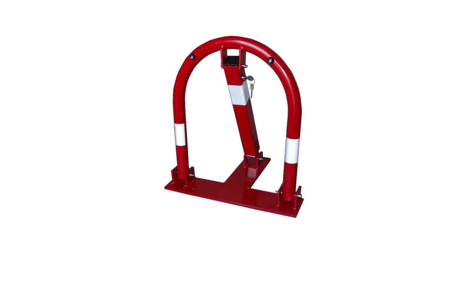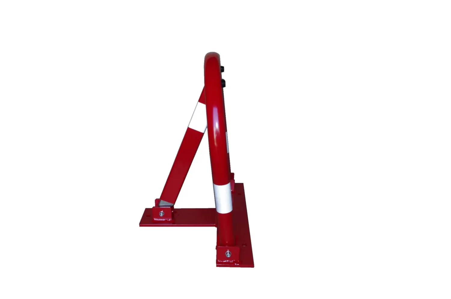Červeno-bílá parkovací zábrana vyrobená z vysoce kvalitní oceli se vyznačuje odolností a masivností. Zábrana má svislý sloupek a profilované, klenuté břevno. Tato zábrana je přáškově lakovaná. Výrobek je viditelný po setmění a za ztížených povětrnostních podmínek. Zábranu je možno zamknout visacím zámkem (zámek je součástí sady).