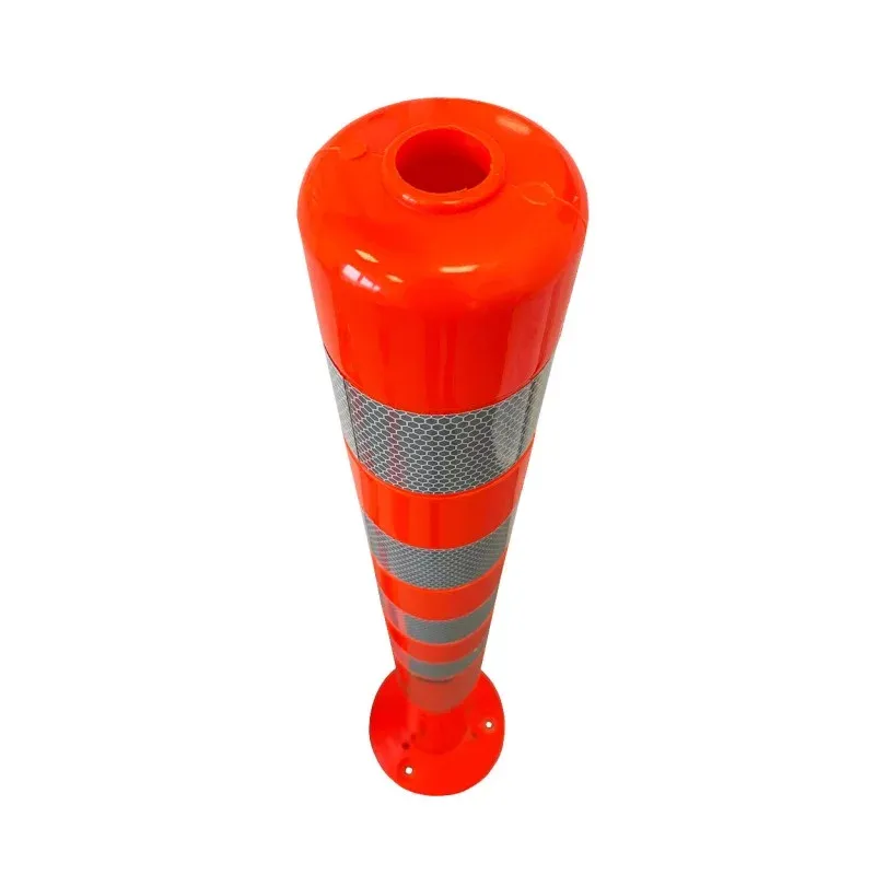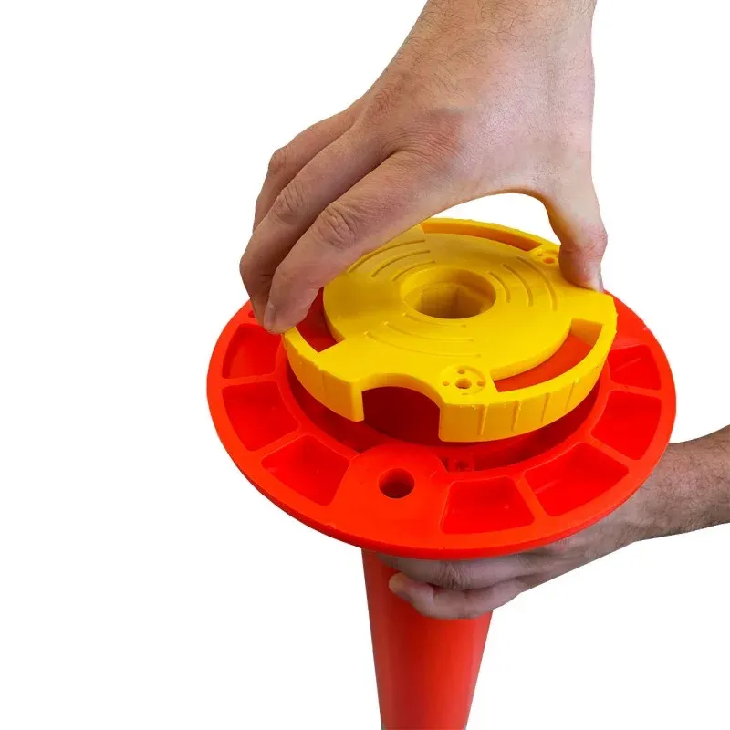 Červený plastový elastický parkovací sloupek s reflexními pruhy je vybaven dvojitou základnou, která zajišťuje vyšší stabilitu a delší životnost tubusu. Žlutá základna se uchycuje do podkladu pomocí tří šroubů, oranžová krytka se nasazuje po instalaci trubky. Díky tomuto systému je výměna tubusu rychlá a nevyžaduje demontáž celé základny. Pružný materiál a tvar zajišťují návrat sloupku do původní polohy po nárazu, bez poškození samotného výrobku či karoserie vozidla.