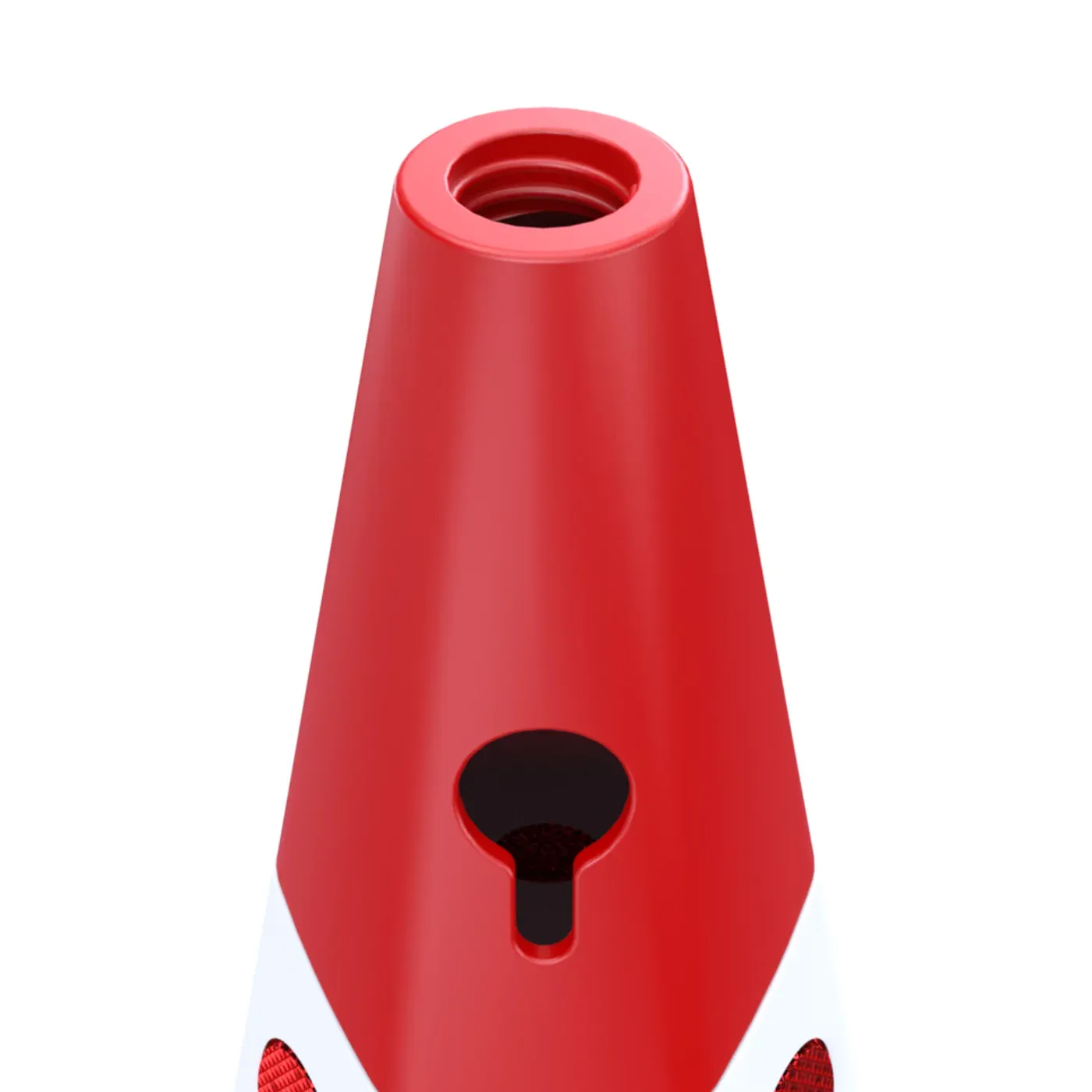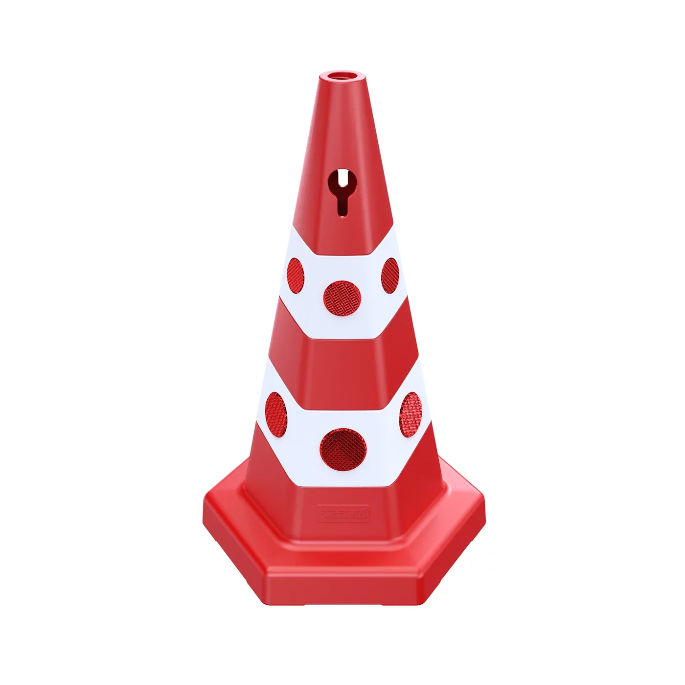 Reklamní reflexní kužel je vyroben z vysoce kvalitního PVC materiálu s příměsí polypropylenu (PPC), který zajišťuje dlouhou životnost, vysokou pružnost a odolnost vůči povětrnostním vlivům. Díky robustní konstrukci o hmotnosti 6 kg nabízí kužel vynikající stabilitu i při nárazech nebo silném větru. Reflexní červeno-bílé pruhy zaručují maximální viditelnost ve dne i v noci.