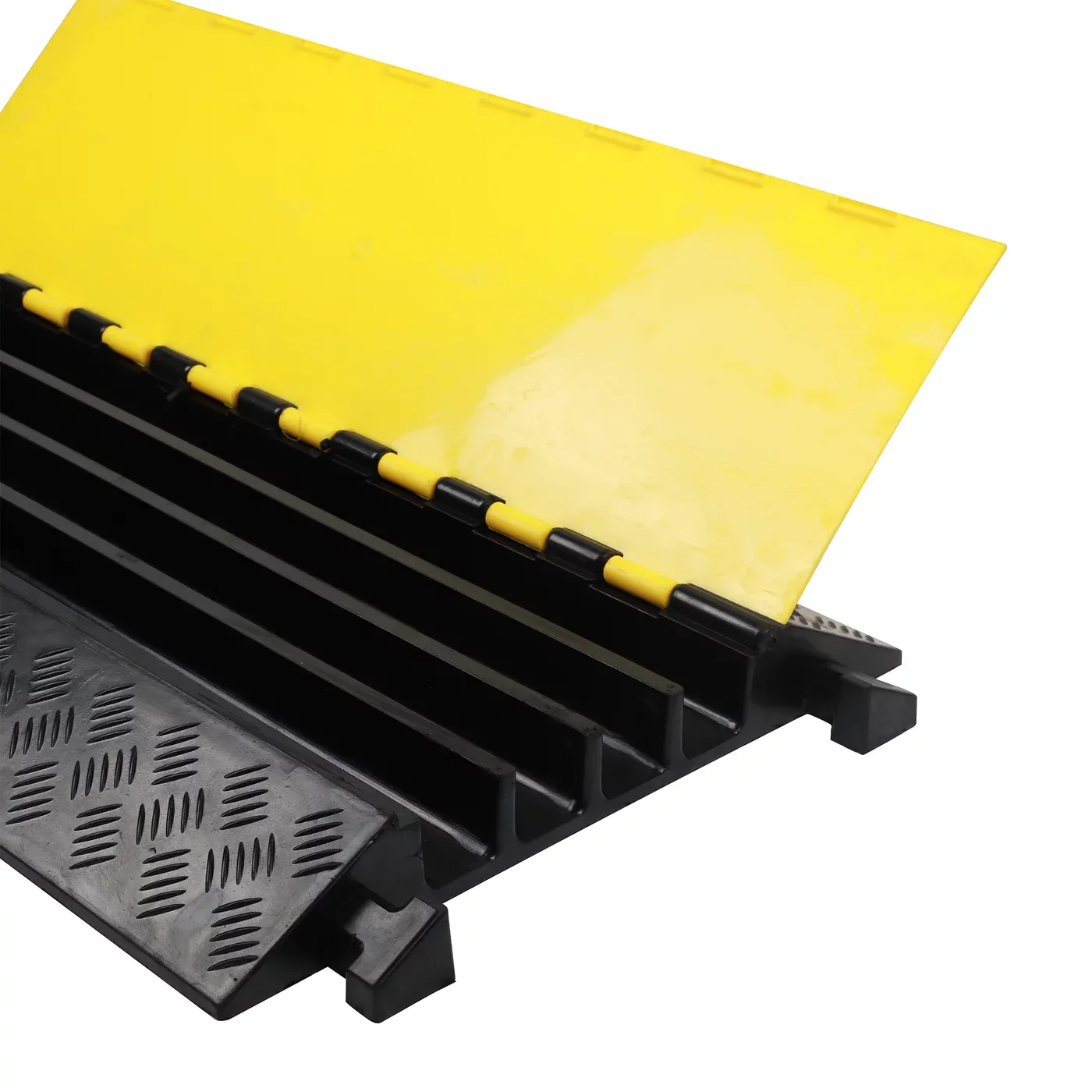 Konstrukce mostu nabízí čtyři prostorné kanály o rozměrech 50 × 42 mm. Je vyroben z prémiové kombinace technické gumy a PVC, která vyniká schopností absorbovat nárazy, tlumit vibrace a odolávat chemikáliím, jako jsou benzín, oleje či kyseliny. S úctyhodnou hmotností 15 kg a protiskluzovou úpravou povrchu zajišťuje most maximální stabilitu i při frekventovaných přejezdech. Kontrastní černo-žluté provedení s výrazným výklopným víkem funguje jako jasný varovný prvek, který zvyšuje bezpečnost práce v průmyslových halách, areálech i na veřejných prostranstvích.