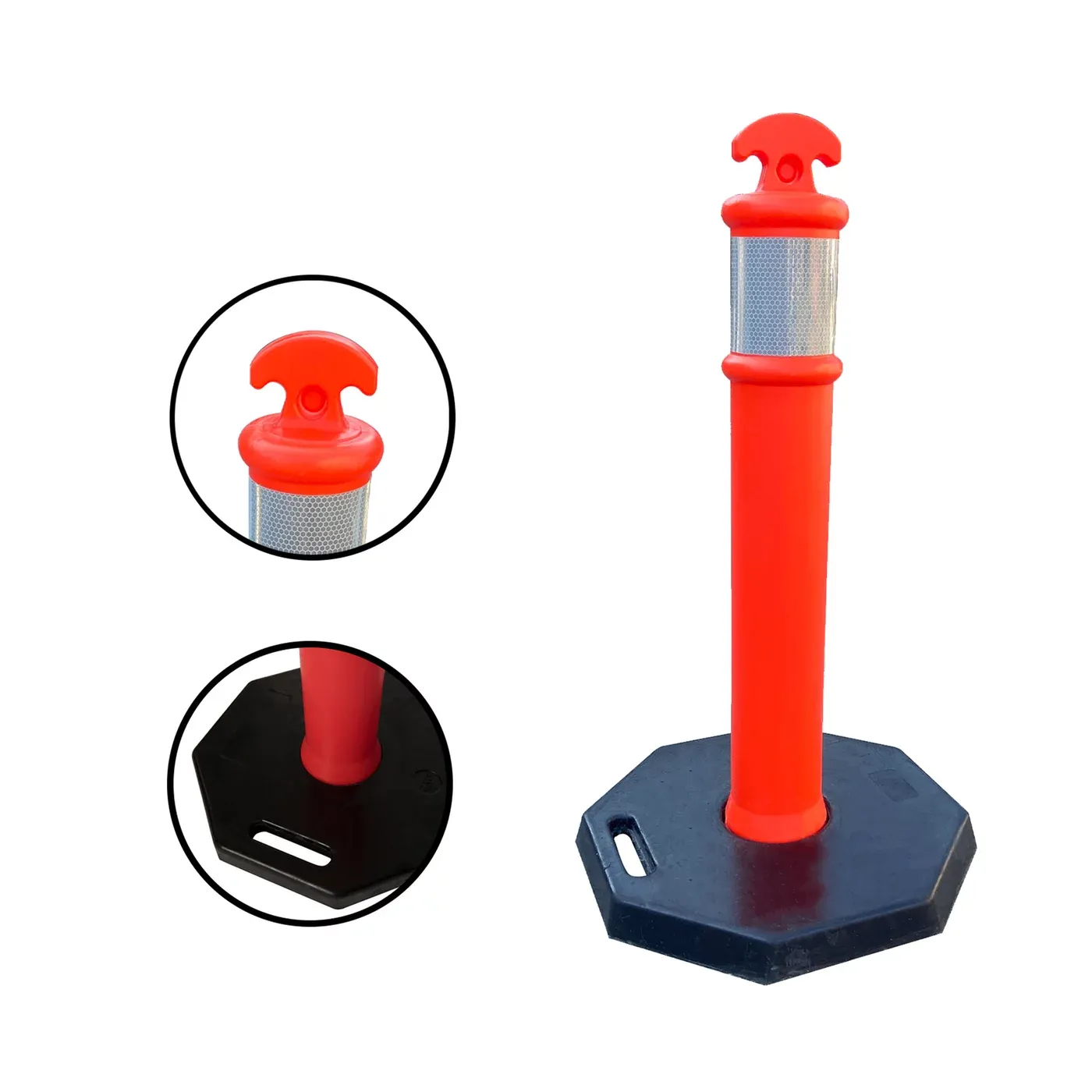 Plastový vymezovací sloupek s gumovou základnou představuje profesionální řešení pro řízení dopravy a organizaci prostoru s důrazem na maximální stabilitu. Tento sloupek slouží jako vysoce viditelná bariéra, která pomáhá usměrňovat vozidla, vymezovat parkovací plochy nebo chránit chodce a budovy v logistických i městských areálech. Díky své robustní konstrukci je ideální pro místa, kde je vyžadována odolnost proti povětrnostním vlivům a stabilní umístění bez nutnosti pevného kotvení.
