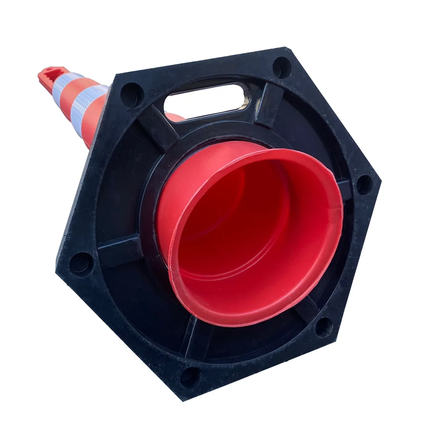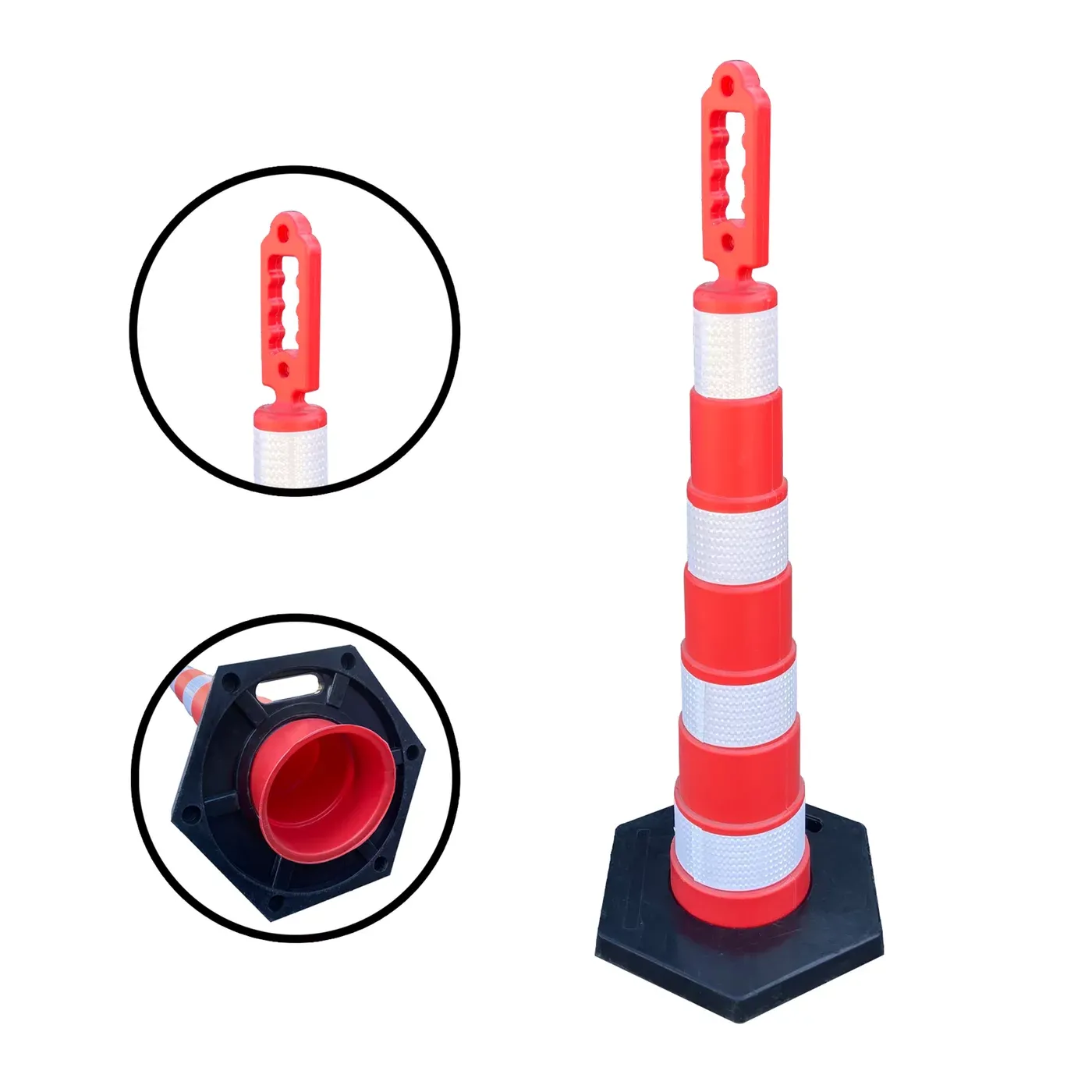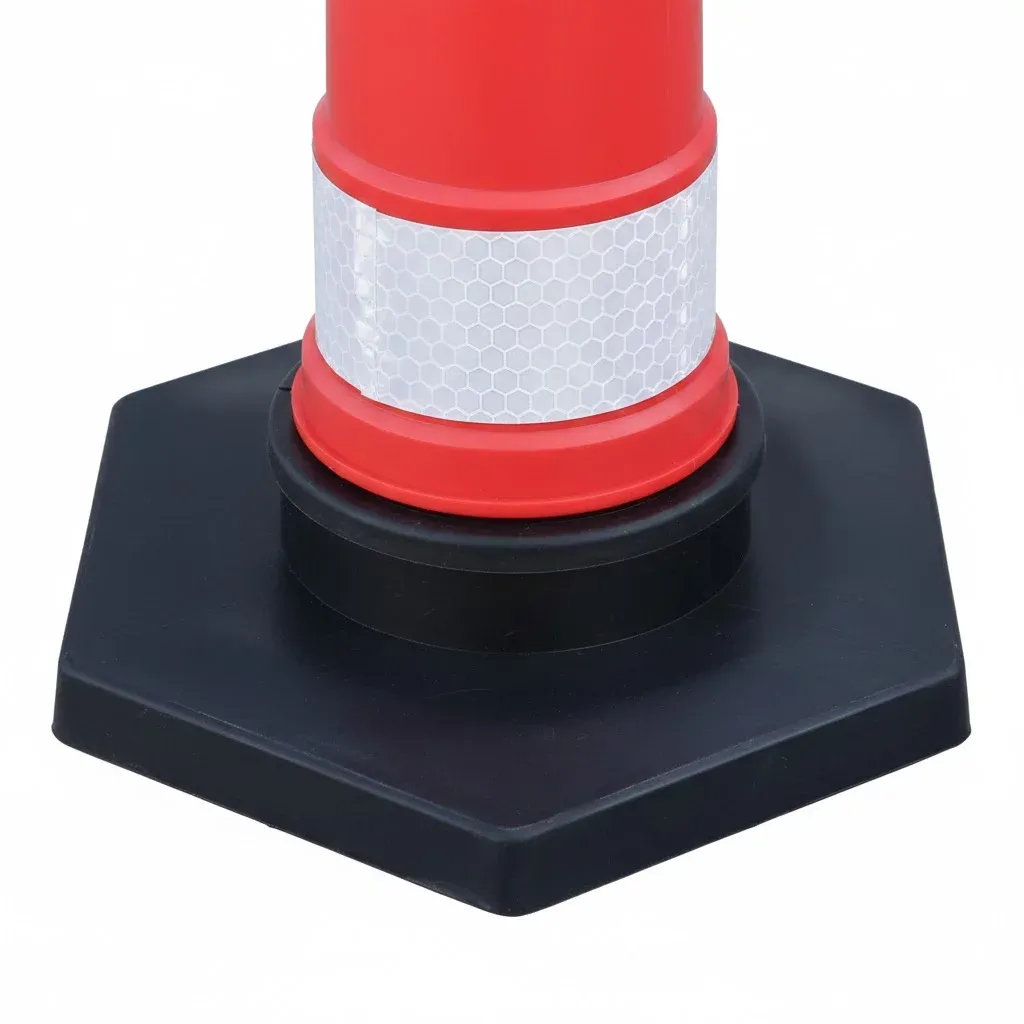 Plastový sloupek vyniká svou stabilitou díky masivní gumové základně o hmotnosti 5 kg s průměrem 48 cm, která bezpečně ukotvuje vysoký profil sloupku i bez nutnosti vrtání do podkladu. Celý prvek je vyroben z vysoce kvalitního polyethylenu (PE), který vyniká elasticitou a tvarovou pamětí. Materiál je plně odolný vůči UV záření, oděru i extrémním teplotám, což zajišťuje jeho dlouholetou životnost a barevnou stálost v náročném venkovním prostředí.