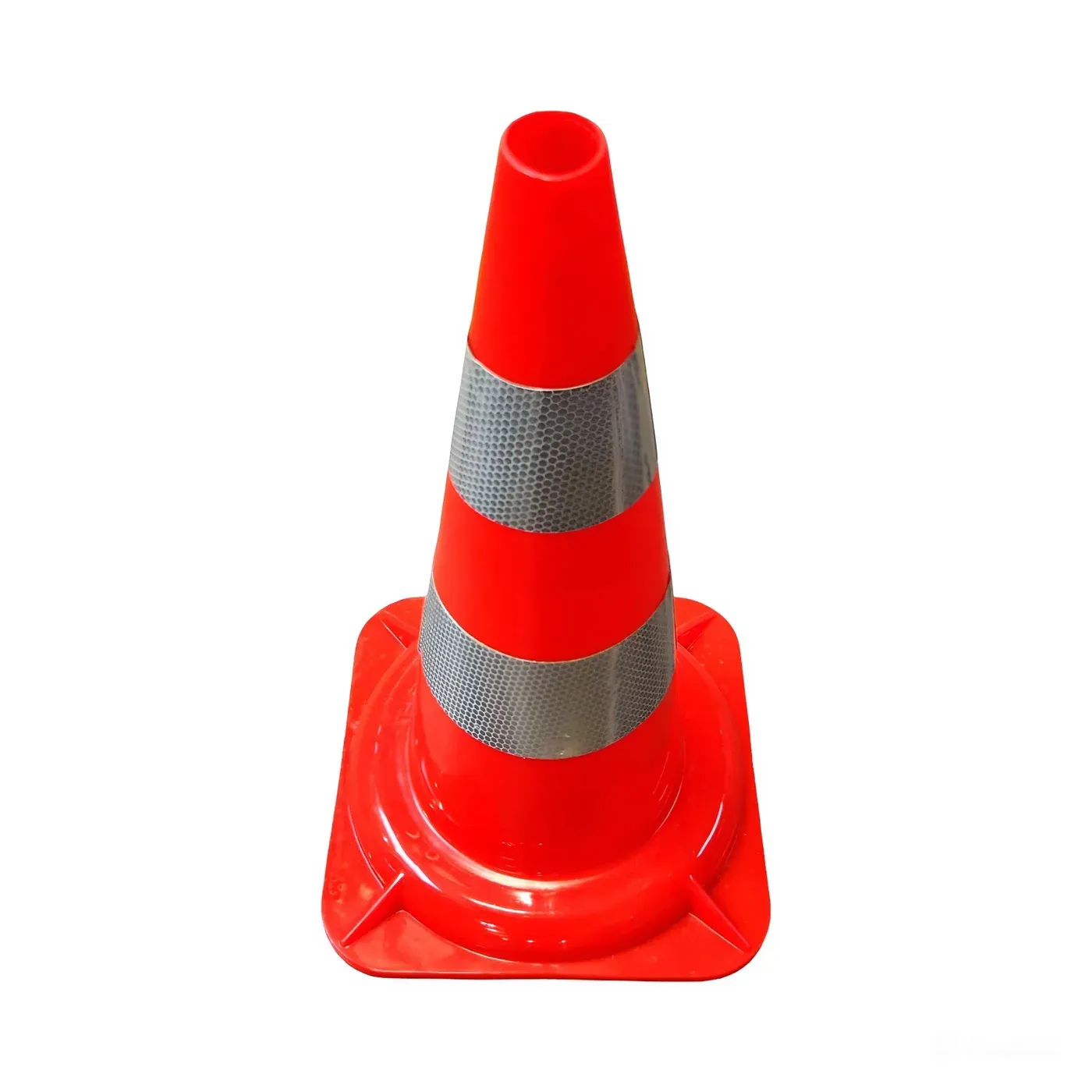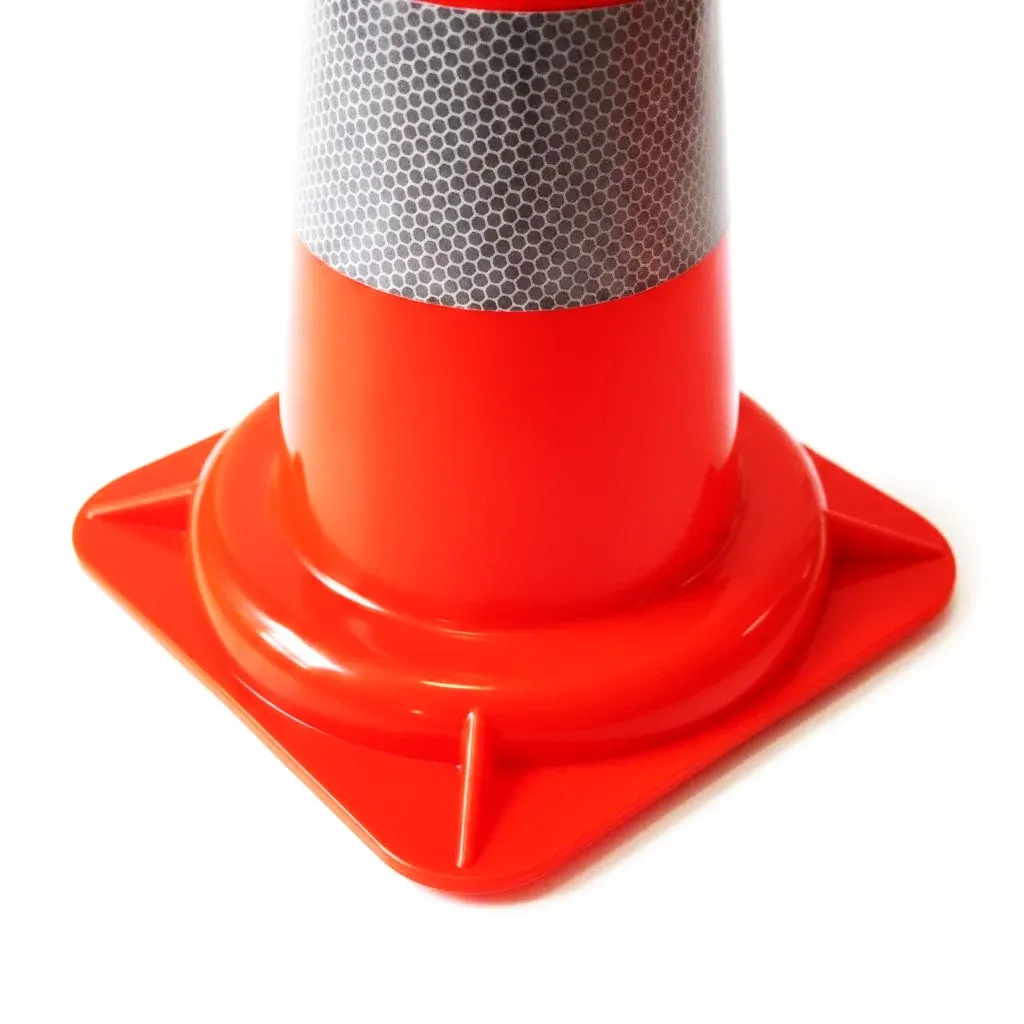 Maximální viditelnost za každé situace zajišťuje výrazná oranžová barva těla kuželu doplněná o dva bílé reflexní pruhy o šířce 8 cm. Tato dvojitá reflexní plocha zaručuje, že kužel je včas a zřetelně rozpoznatelný i za šera, v noci nebo při nepříznivých povětrnostních podmínkách, jako je déšť či mlha. Čtvercová základna o rozměru 29,5 × 29,5 cm poskytuje kuželu stabilitu a odolnost proti převržení prouděním vzduchu od projíždějících vozidel.