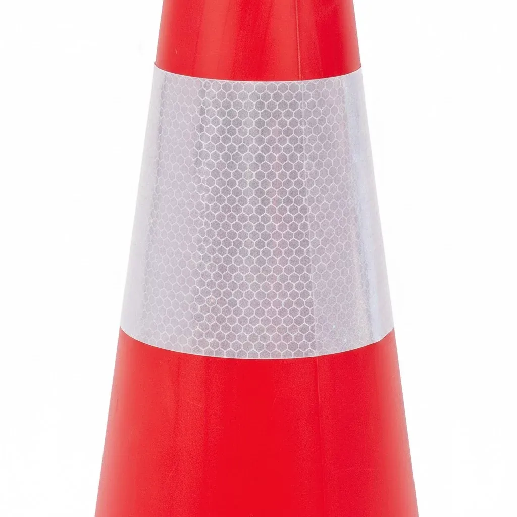 Maximální viditelnost a včasné varování zajišťuje výrazná červená barva doplněná o reflexní pruh o šířce 10 cm. Tento široký pruh efektivně odráží dopadající světlo, čímž zaručuje, že je kužel dobře rozpoznatelný i za šera, v noci nebo při zhoršených povětrnostních podmínkách. Klíčovou předností je těžká gumová základna o rozměru 28 × 28 cm, která výrazně zvyšuje stabilitu kuželu a zabraňuje jeho převržení větrem nebo prouděním vzduchu od projíždějících aut.