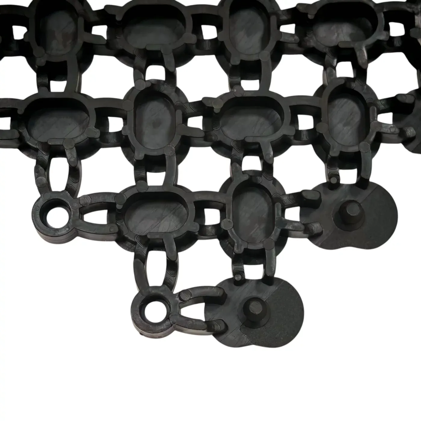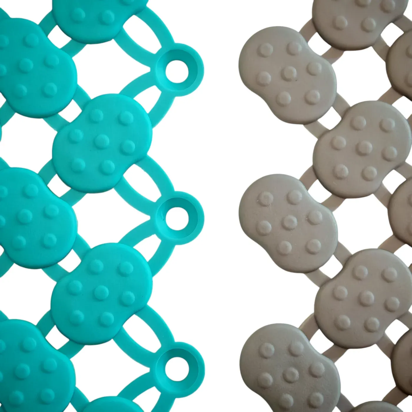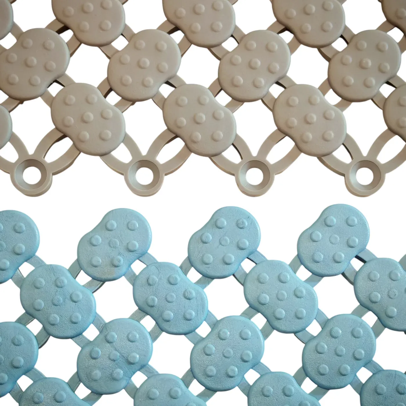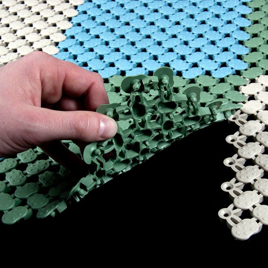 Rohožka je modulární, což umožnuje dosáhnout v podstatě jakéhokoliv rozměru a to velice snadným napojením jednotlivých modulů na sebe (viz foto). Lze také kombinovat různé barvy (nabízíme béžovou, zelenou, modrou) a tím dosáhnout zajímavých designů. V případě potřeby lze rohož zkrátit (seříznout nožem), aby rohož pasovala například okolo stěn.