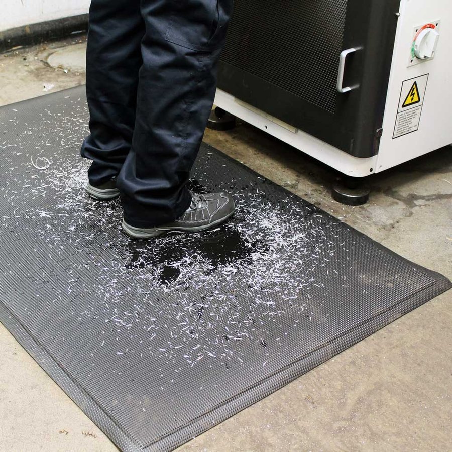 Černá průmyslová protiúnavová olejivzdorná rohož navržená pro náročné pracovní prostředí s odolnosti vůči olejům. Horní vrstva rohože je vyrobena z revolučního materiálu PolyNit, který je odolný většině průmyslových olejů a chemikálií. Měkká vnitřní vrstva vyrobena z PVS pěny, která je uzavřena v materiálu PolyNit, vytváří pohodlný povrch, který snižuje únavu a zdravotní problémy způsobné dlouhodobým stáním. Vyvýšený strukturovaný diamantový povrch zaručuje vynikající protiskluzové vlastnosti (splňuje normu DIN 51130, R11).