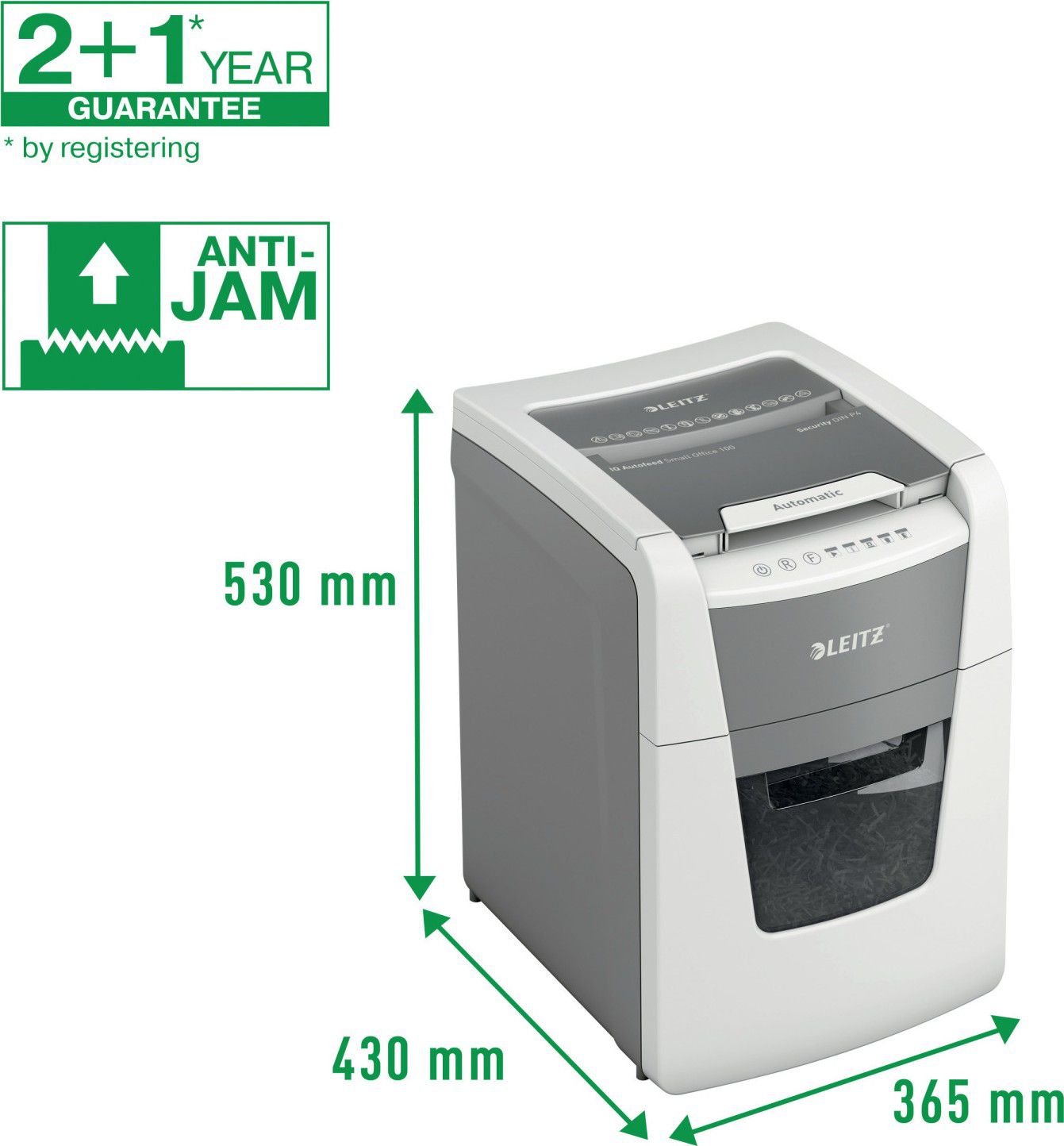 Plně automatická skartovačka papíru od firmy Leitz s jedinečnou čistou vyprazdňovací funkcí. Je tak inteligentní, že tiše pracuje sama, jen vložte stoh papíru (včetně sponek a svorek), zavřete víko a jděte si po své práci. Ideální pro použití v malé kanceláři. Důvěrná bezpečnost a vynikající výkon s touto skartovačkou s automatickým podáváním, s funkcí proti zaseknutí papíru, tichou a s dlouhým provozem (20 minut). Automaticky skartuje 100 listů A4 s úrovní zabezpečení P4 (4x28 mm) s křížovým řezem do velkého koše s objemem 34 l. Jednoduché ovládání pomocí dotekových prvků.