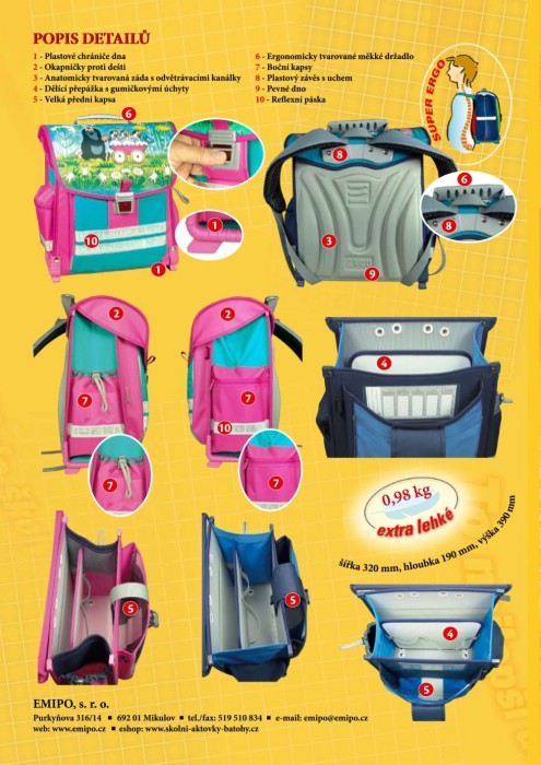 Vnitřní část žákovského školního batohu je členěna pohyblivou přepážkou na dvě části. Její plynule měnitelnou polohu umožňuje šlová pruženka. Tím je zajištěna větší variabilita pro vnitřní uspořádání jednotlivých školních pomůcek (sešitů, knih apod.) podle individuální potřeby žáka. Na této přepážce jsou také vytvořeny pružné úchyty pro upevnění např. sešitů formátu A5, žákovské knížky, hygienických kapesníčků, mobilního telefonu apod. Na předním dílu je našita plastová kapsička s týdenním rozvrhem hodin a jmenovkou a dále velká kapsa rozměru š.230 x h.50 x v.260mm. Její horní část se uzavírá pomocí popruhu se suchým zipem. Přes celou šířku přední kapsy jsou našity dva bezpečnostní reflexní pásky a přes obě boční kapsy jeden. školní batoh je uzavřen prostorově tvarovanou klopnou přes celý svůj obvod, včetně přední kapsy. Tím je chráněn obsah batohu před znehodnocením při deštivém počasí. Klopna je zajištěna proti otevření plastovou batohovou sponou (tzv. trojzubcem). Její spodní část lze přitáhnou (popř. povolit) podle množství učebních pomůcek uvnitř školního batohu. Zadní část batohu je opatřena nově vyvinutými anatomicky tvarovanými zády ERGO vyrobenými z gumové pěny na povrchu potažené bavlněnou textilií. Jejich tuhost je nastavena tak, aby se jednak neprotláčel obsah batohu do zad školáka a také aby tzv. seděla na zádech a držela správnou polohu páteře. Dolní část batohu je opatřena ochrannými plastovými rohy, které mimo jiného, umožňují dlouhodobé stání aktovky na mokré podložce, aniž by hrozilo znehodnocení jejího obsahu. Při celkových rozměrech š.320 x h.190 x v.380mm váží batoh pouhých 0,98kg! Naše společnost Vám nabízí extra lehký školní batoh s pevnou konstrukcí a užitnými vlastnostmi školní aktovky (tzv. aktovku batohového typu