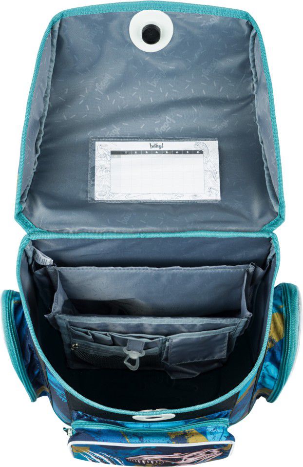 - Uvnitř aktovky je průhledná kapsa na rozvrh a vnitřní organizér umožňující rovnoměrné rozložení hmotnosti.