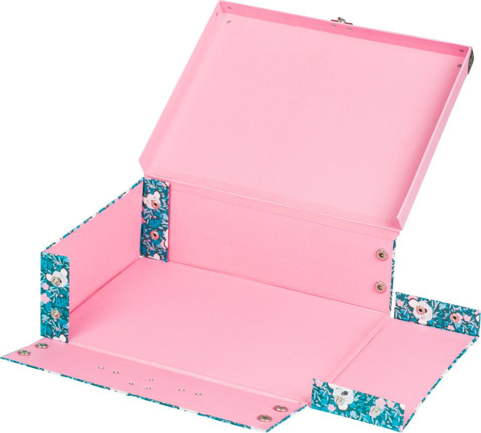 - Skládací kufřík z pevného laminovaného papíru s okovanými rohy.