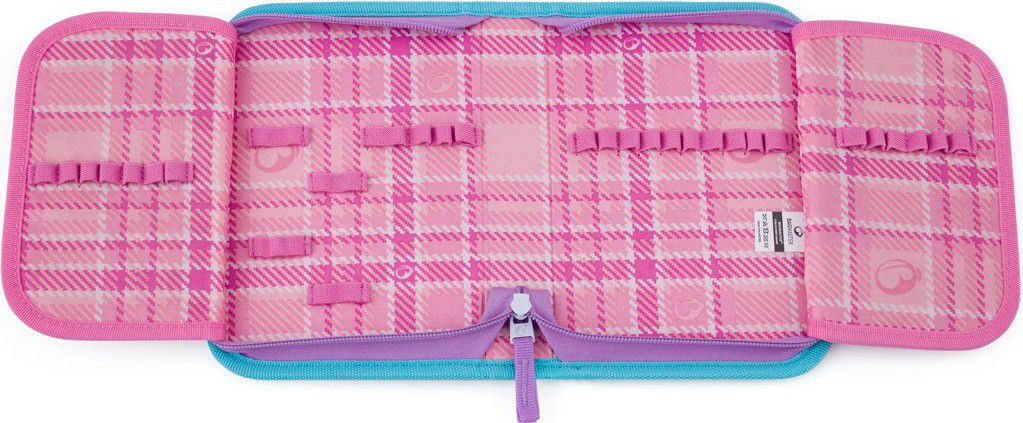 - Na dvou otevíravých chlopních jsou gumové úchyty na tužky, pera a pastelky a kapsička na další drobnosti.