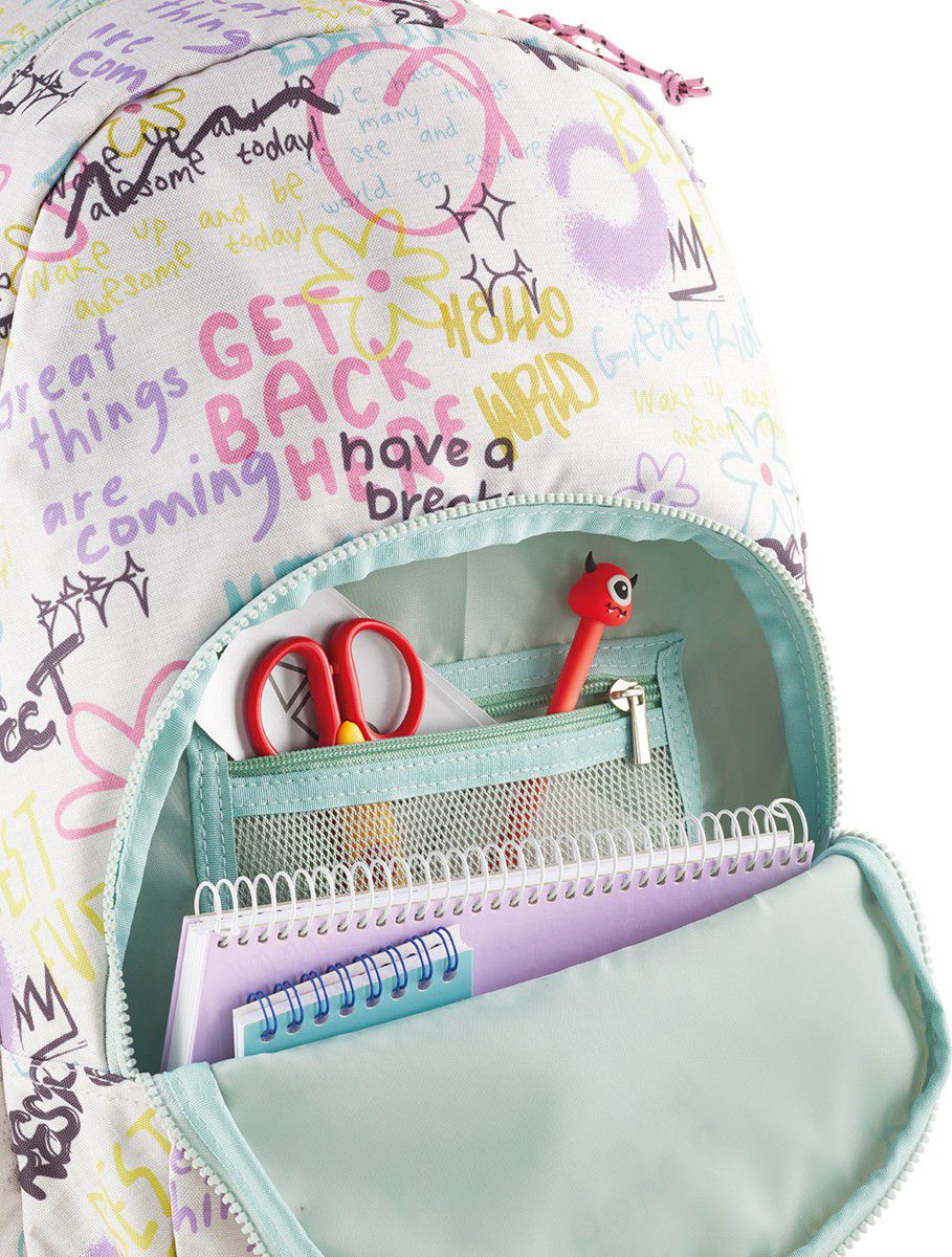 Moderní, lehký batoh v jemném barevném motivu určený začínajícím teenage holkám. Dělení na dvě kapsy poskytuje dostatek prostoru pro školu a osobní drobnosti. Recyklovaný odolný materiál prodlužuje životnost, zesílené výztuhy zespodu chrání batoh před poškozením a znečištěním.