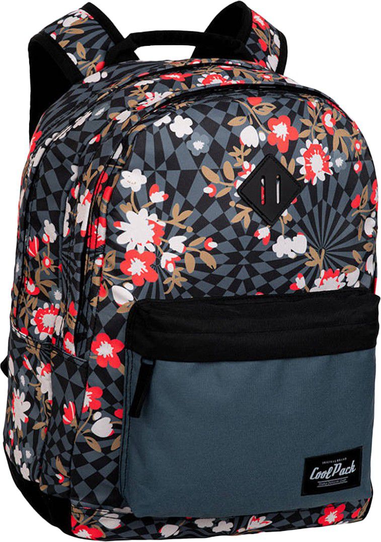 Tmavý, geometrický podklad s jemným motivem červených a růžových květů jarmanek. Jednotný design kolekce produktů, které naleznete v i ostatních kategoriích značky CoolPack.
