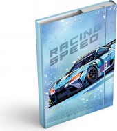 - Školní světle modré desky na sešity ve velikosti A4 s motivem závodního auta.