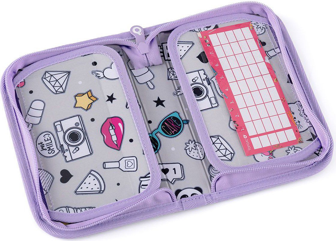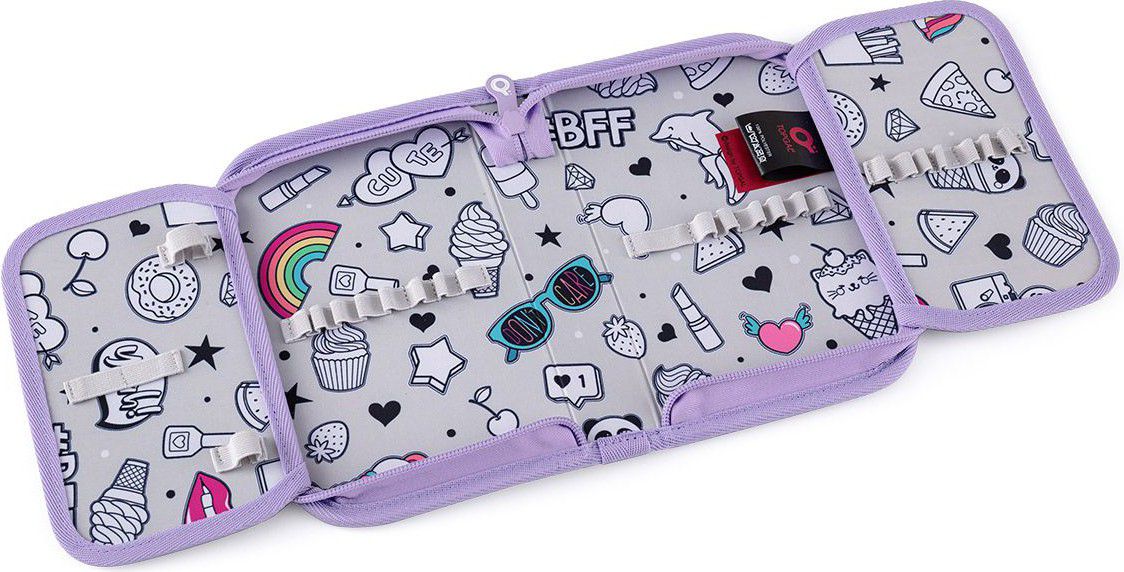 Jednopatrové školní pouzdro se dvěma klopami. Díky gumovým úchytům se do nich vejde celkem dvacetjedna pastelek, tužek a fixek. Tři širší úchyty poslouží na pravítko, kružítko či nůžky. Dva větší na gumu a ořezávátko.
