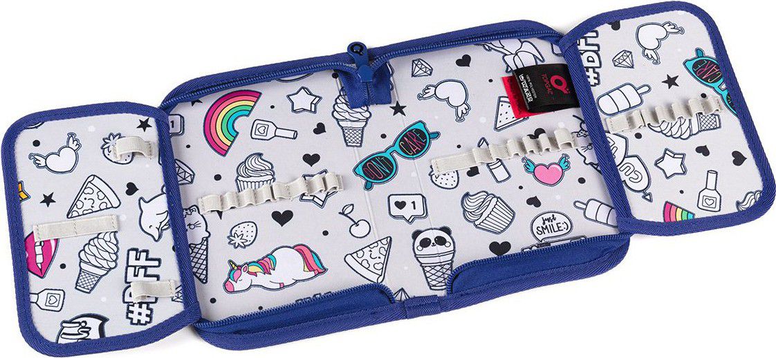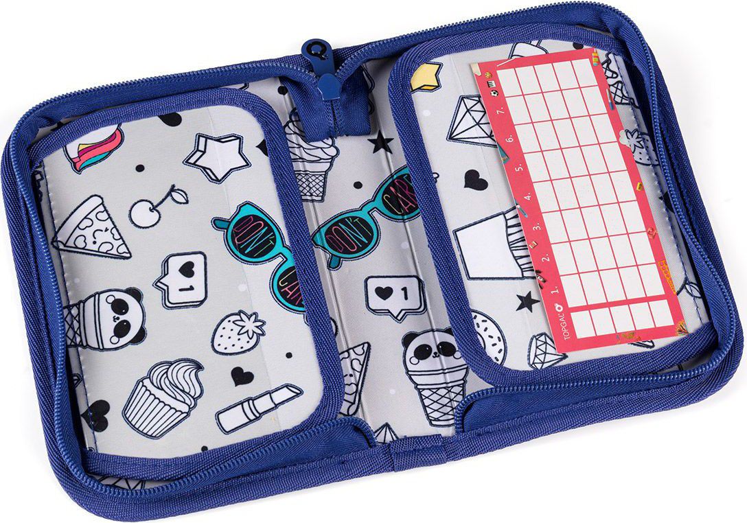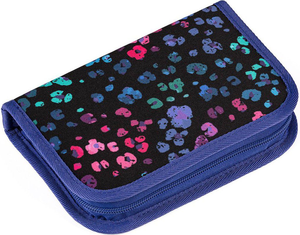 Jednopatrové školní pouzdro se dvěma klopami. Díky gumovým úchytům se do nich vejde celkem dvacetjedna pastelek, tužek a fixek. Tři širší úchyty poslouží na pravítko, kružítko či nůžky. Dva větší na gumu a ořezávátko.