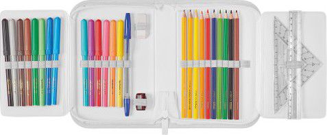 - 20,3 x 14 x 3,5 cm 31 dílů - 14 fixů, 8 šestihranných pastelek, 2 tužky, ořezávátko, guma, 16 cm pravítko, trojúhelník, kuličkové pero, rozvrh hodin, vizitka
