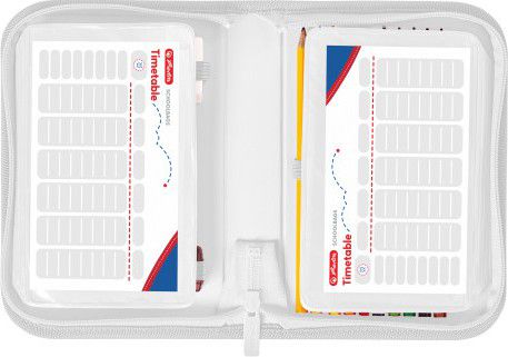 - 31 dílů - 14 fixů, 8 šestihranných pastelek, 2 tužky, ořezávátko, guma, 16 cm pravítko, trojúhelník, kuličkové pero, rozvrh hodin, vizitka