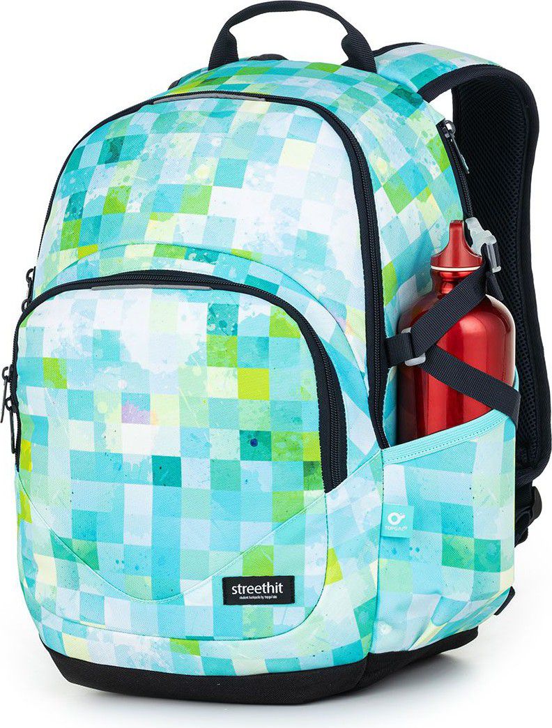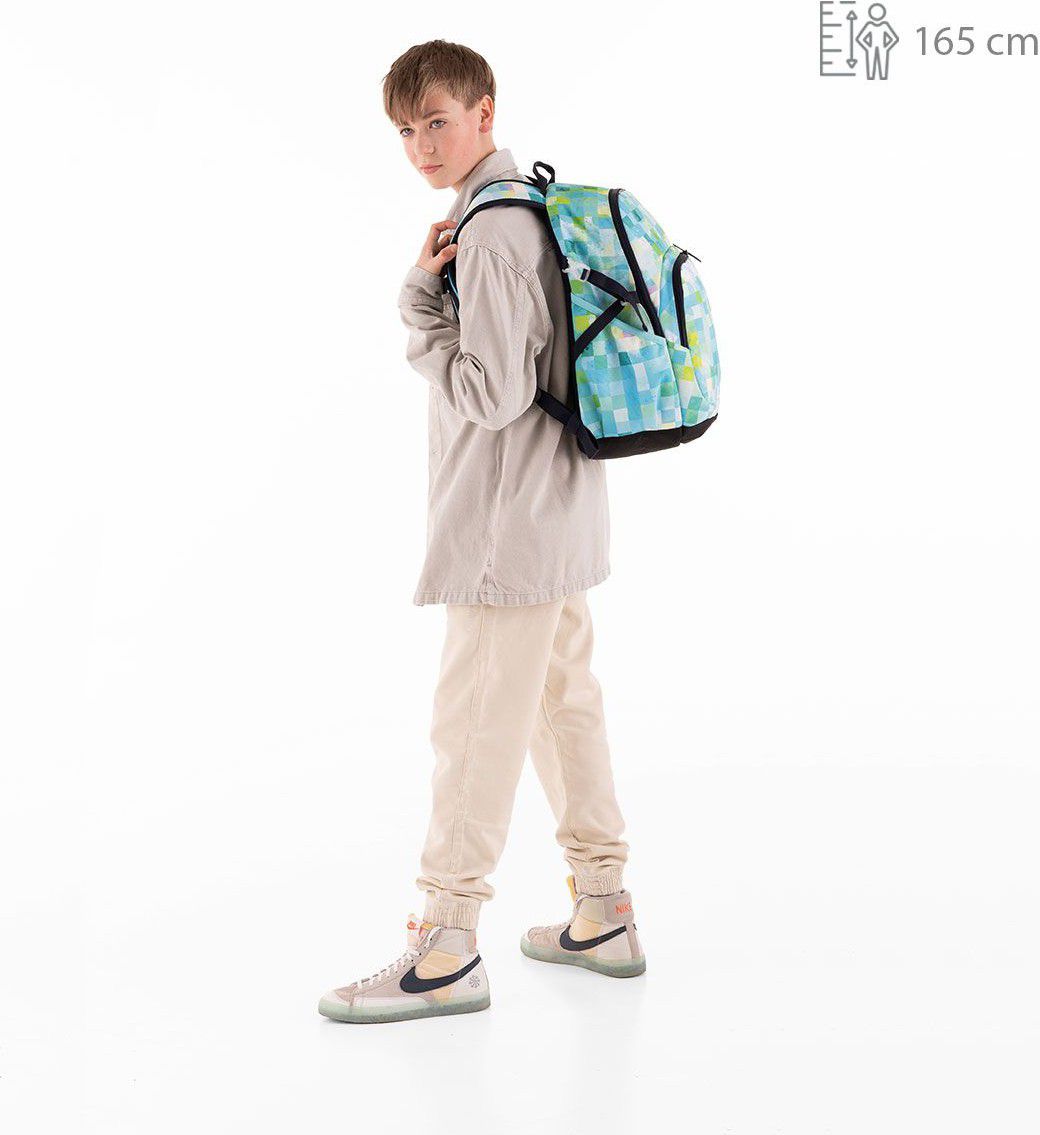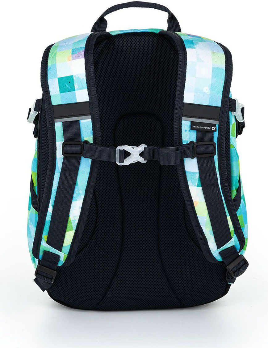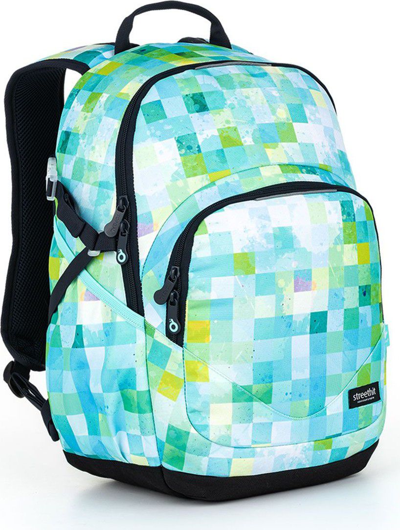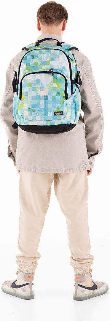 Jedna hlavní objemná komora pojme vše potřebné. Uvnitř komory najdete i polstrovanou kapsu na notebook, malou kapsu na zip a karabinku na klíče našitou na dlouhé pružence. Spousta věcí se vám vejde ale i do přední menší kapsičky - třeba penál ve stejném designu. Uvnitř malé kapsičky je navíc další síťová kapsa na zip.