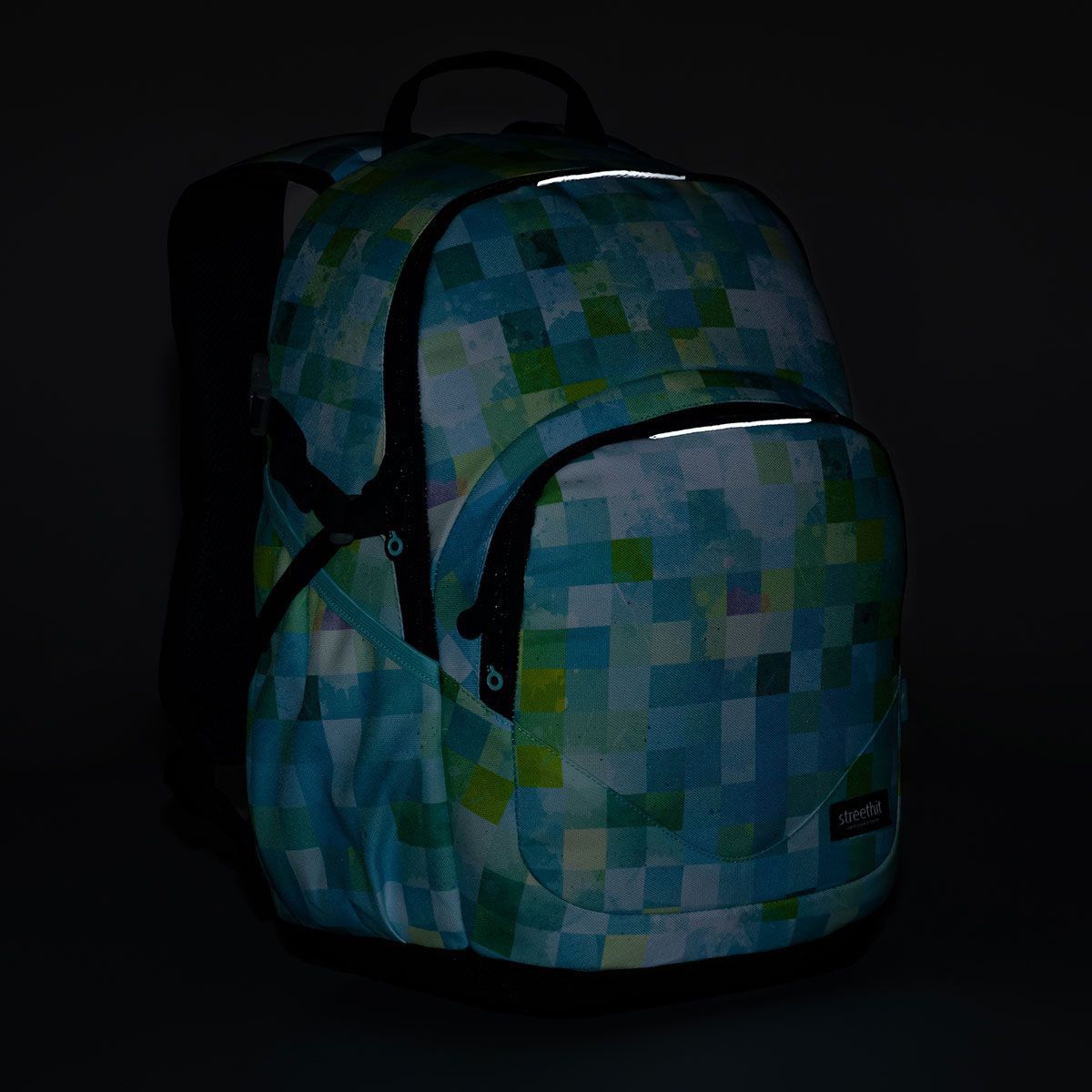 Po bocích batohu jsou dvě kapsy menší kapsy. Kapsa na lahev na pití je doplněna o kompresní popruh. Díky němu do kapsy umístíte klidně i 1,5 litrovou PETku. Reflexní prvky jsou jemně zasazené do čela batohu a na ramenních popruzích. Batoh je opatřen zátěrem proti dešti, stejně tak jako dno z pevného, nepromokavého materiálu TOPDURA.