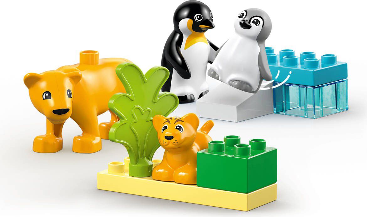 Vydejte se s dětmi od 2 let na zábavnou vzdělávací cestu z Antarktidy do Afriky s touto roztomilou stavebnicí s přírodní tematikou. Stavebnice Rodinky divokých zvířat: Tučňáci a lvi obsahuje 2 tučňáky a 2 lvy LEGO DUPLO, kteří děti inspirují k hodinám zábavného kreativního hraní. Představte dětem rozdíly mezi dospělými zvířátky a jejich mláďaty a ukažte jim tropické a chladné podnebí. Pomozte své ratolesti rozvíjet pečovatelské dovednosti při hře na dospělá zvířátka, která se starajío svá mláďata. Ukažte jim, že stejně jako vy si i zvířecí rodiče rádi hrají se svými potomky. Společně postavte ledovou skluzavku pro tučňáky a travnatou plochu, na které si mohou hrát lvi. Při hraní a stavění bude vaše dítko rozvíjet své jemné motorické dovednosti.