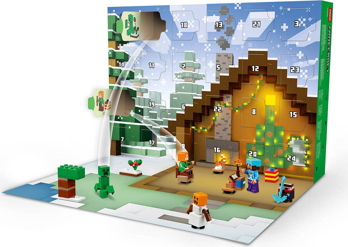 - Za každým z 24 okének se skrývá jeden dáreček pro děti. Mezi minifigurkami najdete Alex ve svetru s motivem Creepera, Stevea ve svetru s motivem sněhuláka, diamantové helmě a s krumpáčem v ruce, Creepera u keře s bobulemi, utopence s trojzubcem, bludného kostlivce s diamantovou zbrojí, sněžného golema, zombie s očarovanou sekerou a vesničana Santu s pecí.