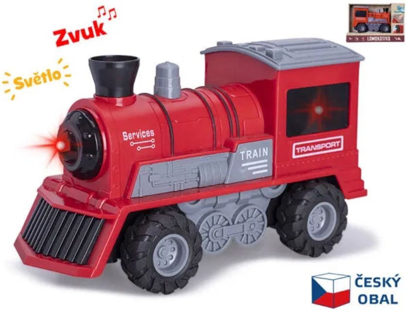 Roztomilá červená lokomotiva se světnými a zvukovými efekty.